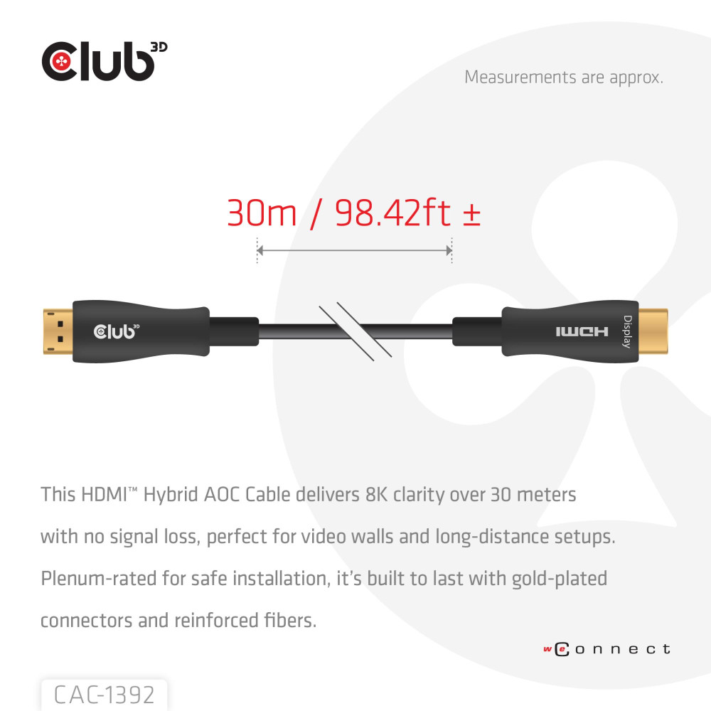 CLUB3D HDMI™ Hybrid AOC Cable 8K60Hz/4K120Hz 30m / 98.42 ft. Cable length: 30 m, Connector 1: HDMI Type A (Standard), Connector 1 gender: Male, Connector 2: HDMI Type A (Standard), Connector 2 gender: Male, Connector contacts plating: Gold, HDMI version: 2.1, Data transfer rate: 48 Gbit/s, Product colour: Black