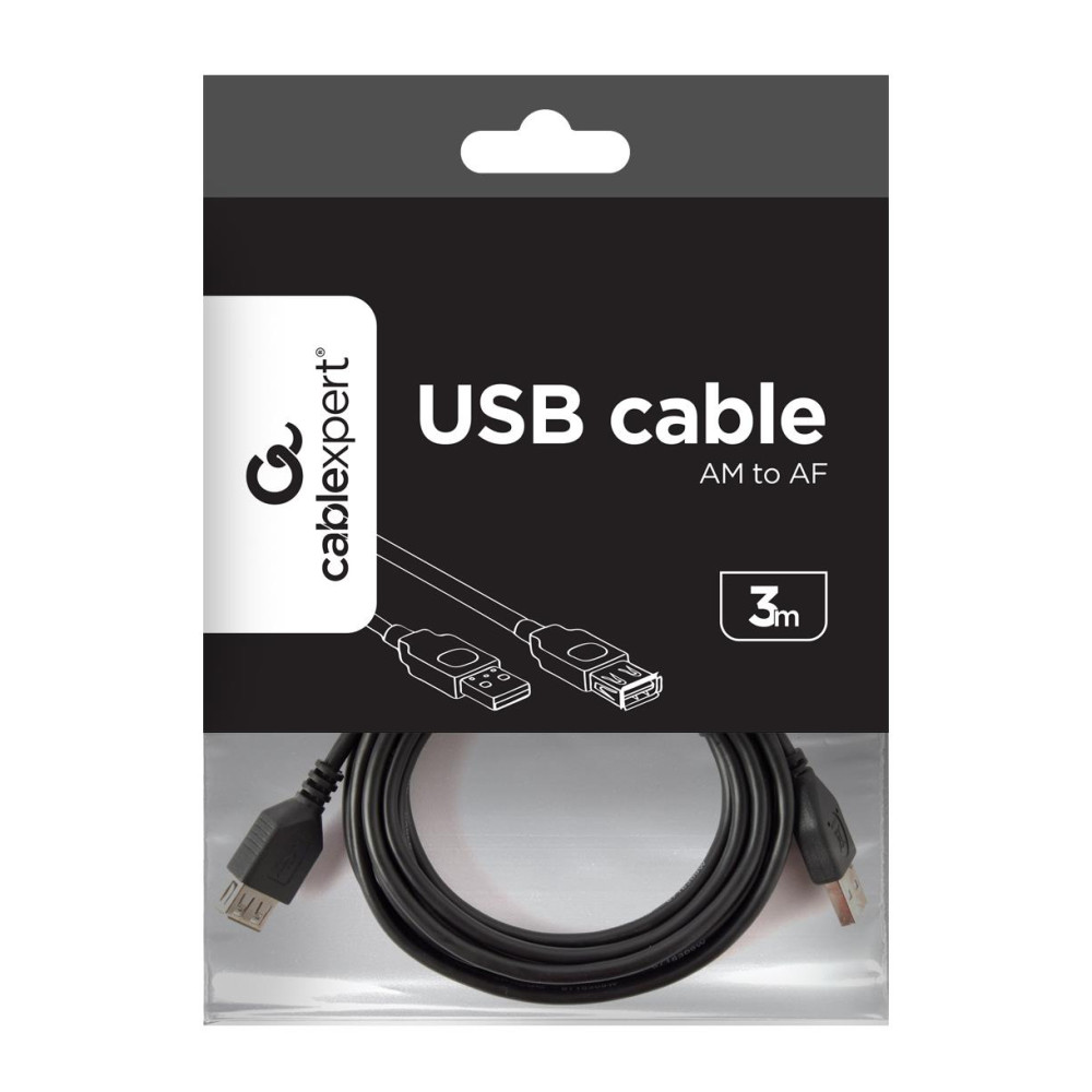 Summary Gembird 3m USB 2.0 A M/FM. Cable length: 3 m. Connector 1: USB A, Connector 2: USB A, USB version: USB 2.0, Connector gender: Male/Female, Product colour: Black
