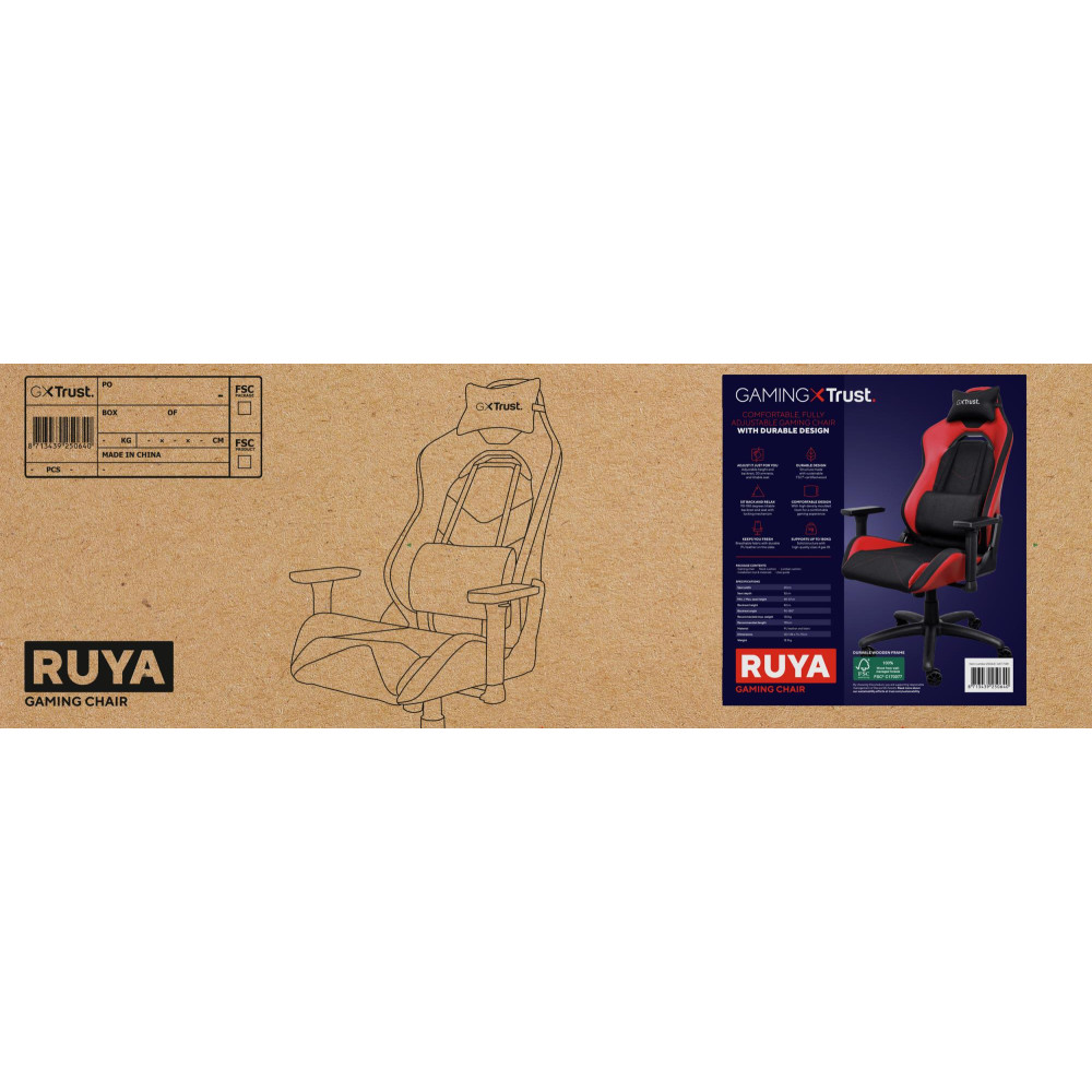 Trust GXT 714 RUYA. Product type: Universal gaming chair, Maximum user weight: 150 kg, Maximum user height: 195 cm. Width: 710 mm, Depth: 750 mm, Height (min): 134 cm. Quantity per pack: 1 pc(s)
