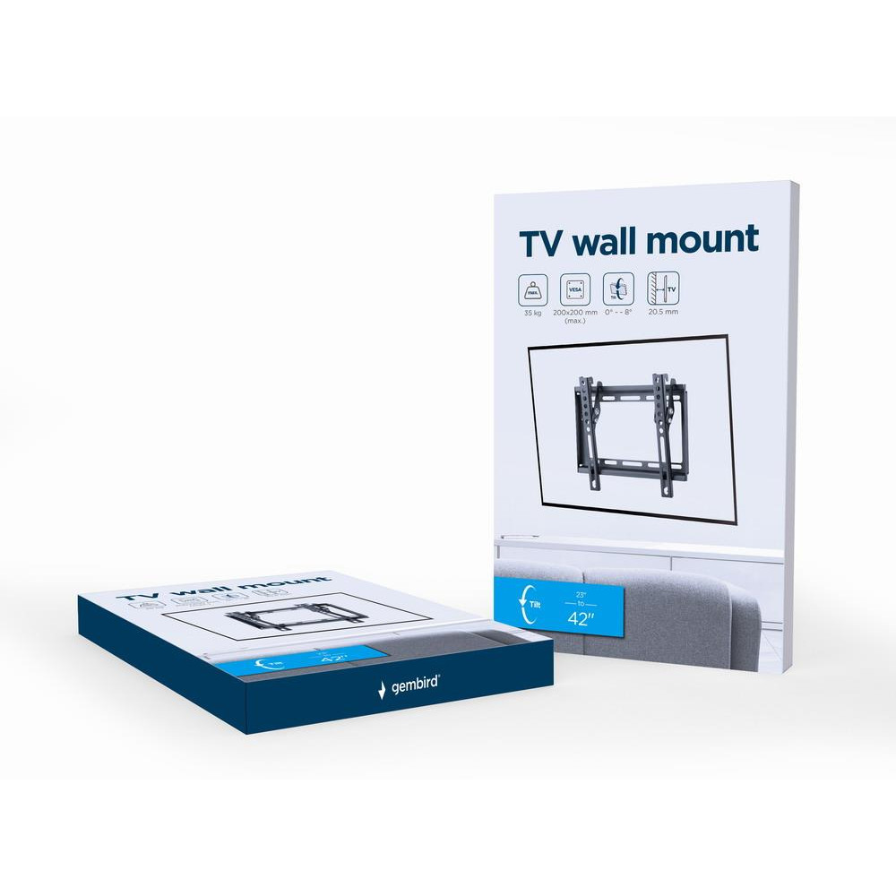Gembird WM-42T-04. Максимальная емкость (вес): 35 kg, Минимальная совместимость от размера экрана: 58,4 cm (23), Максимальный размер экрана: 106,7 cm (42), Минимальное крепление VESA: 50 x 50 mm, Максимальное крепление VESA: 200 x 200 mm. Угол наклона: 0 - 8°, Расстояние от стены (макс): 2,05 cm. Цвет товара: Черный