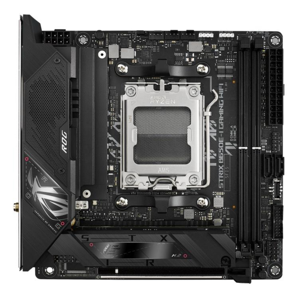 Summary ASUS ROG STRIX B650E-I GAMING WIFI. Производитель процессора: AMD, Сокет процессора: Socket AM5, Совместимые серии процессоров: AMD Ryzen™ 7. Поддерживаемые типы памяти: DDR5-SDRAM, Максимальная внутренняя память: 64 GB, Тип слотов памяти: DIMM. Поддерживаемые интерфейсы носителя: M.2, SATA III, Поддерживаемые типы накопителей: HDD & SSD, Уровни RAID: 0, 1. Тип Ethernet интерфейса: 2.5 Gigabit Ethernet, Основной стандарт Wi-Fi: Wi-Fi 6E (802.11ax), Wi-Fi стандартов: 802.11a, 802.11b, 802.11g, Wi-Fi 4 (802.11n), Wi-Fi 5 (802.11ac), Wi-Fi 6 (802.11ax), Wi-Fi 6E.... Комплектующие для: ПК, Формат материнской платы: Mini ITX, Семейство чипсета материнской платы: AMD