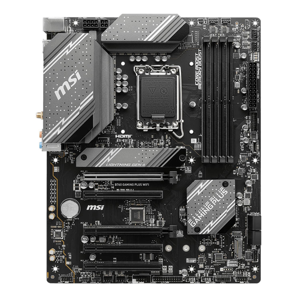 MSI B760 GAMING PLUS WIFI. Производитель процессора: Intel, Сокет процессора: LGA 1700, Совместимые серии процессоров: Процессор Intel® Celeron®, Intel® Pentium® Gold. Поддерживаемые типы памяти: DDR5-SDRAM, Максимальная внутренняя память: 192 GB, Тип слотов памяти: DIMM. Поддерживаемые интерфейсы носителя: M.2, SATA, Уровни RAID: 0, 1, 5, 10. Тип Ethernet интерфейса: 2.5 Gigabit Ethernet, Контроллер LAN: Dragon RTL8125BG, Основной стандарт Wi-Fi: Wi-Fi 6E (802.11ax). Комплектующие для: ПК, Формат материнской платы: ATX, Семейство чипсета материнской платы: Intel