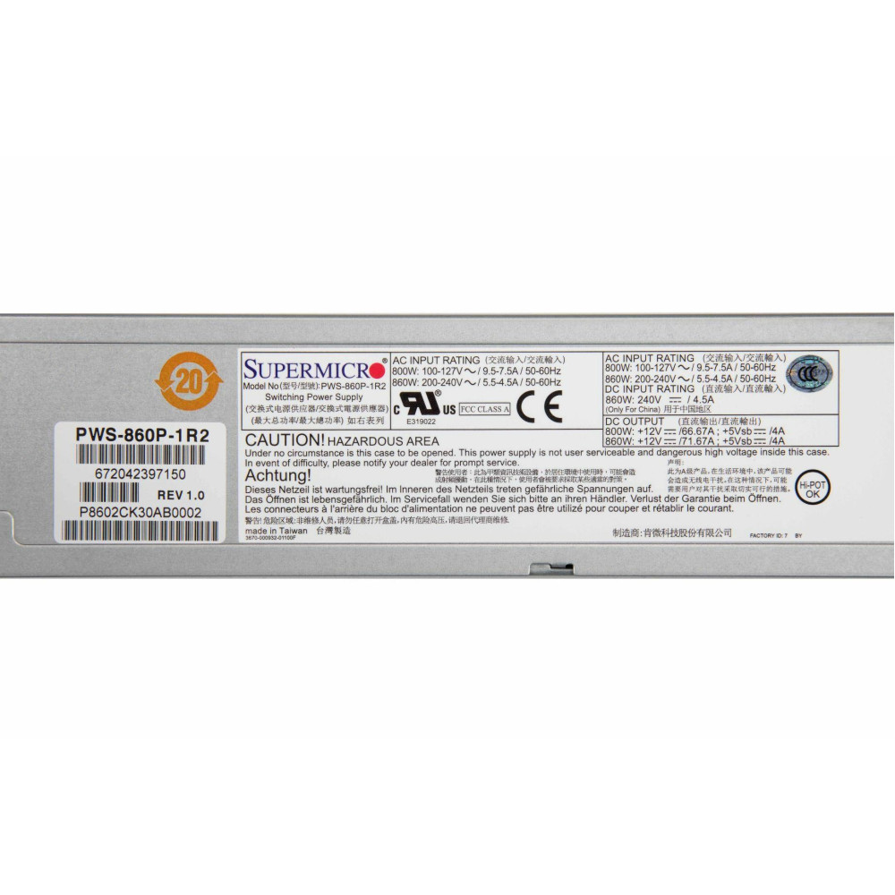 Supermicro PWS-860P-1R2. Total power: 860 W, AC input voltage: 100 - 240 V, AC input frequency: 50/60 Hz. Purpose: Server, Power supply unit (PSU) form factor: 1U, 80 PLUS certification: 80 PLUS Platinum. Compliance certificates: REACH, RoHS. Width: 54.5 mm, Depth: 40.2 mm, Height: 322 mm