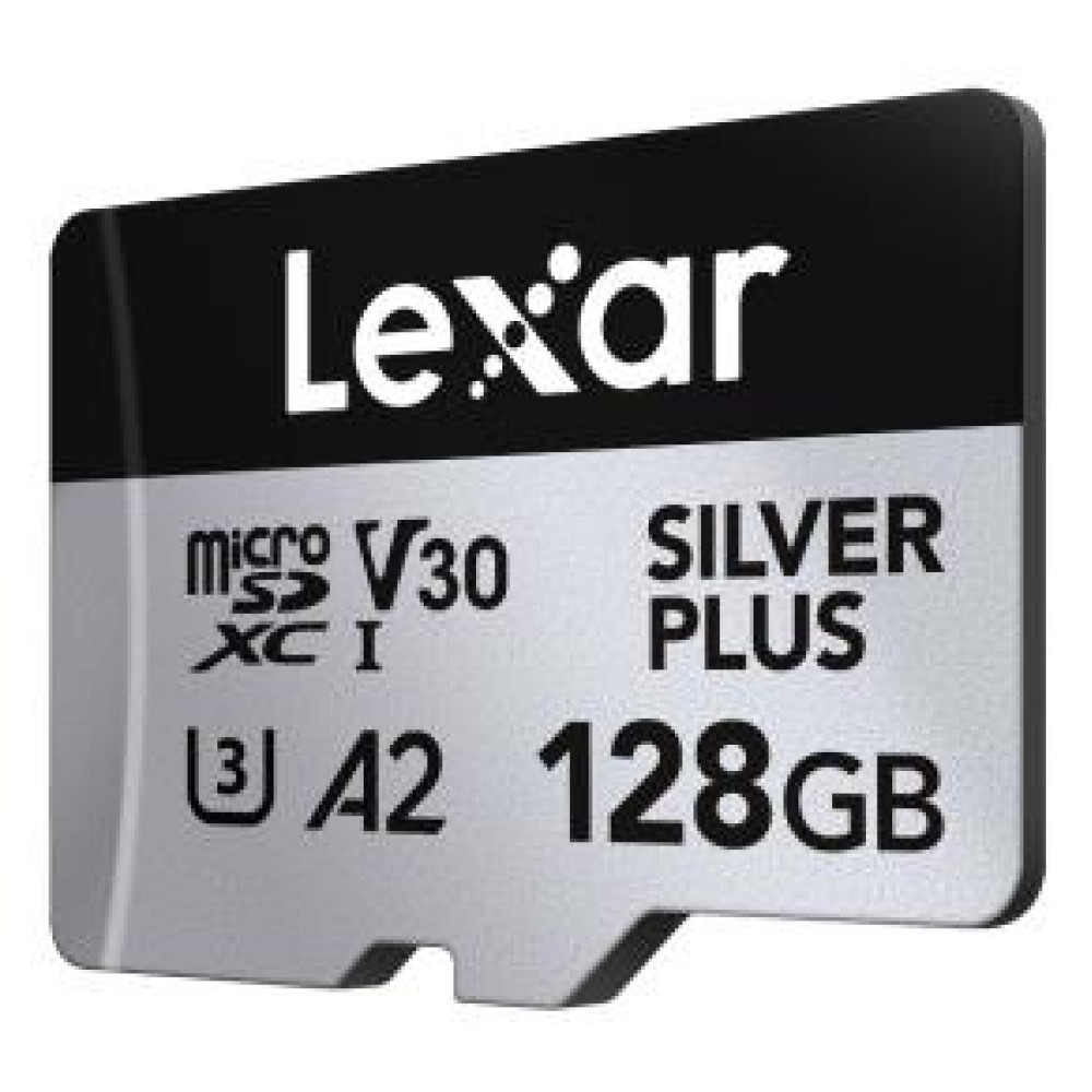 Lexar Professional SILVER PLUS microSDXC UHS-I Card. Capacity: 128 GB, Flash card type: MicroSDXC, Internal memory type: UHS-I, Read speed: 205 MB/s, Write speed: 150 MB/s, UHS Speed Class: Class 3 (U3), Video Speed Class: V30. Protection features: Drop proof, Impact resistant, Magnet proof, Shock resistant, Temperature proof, Waterproof, X-ray..., Product colour: Black, Silver