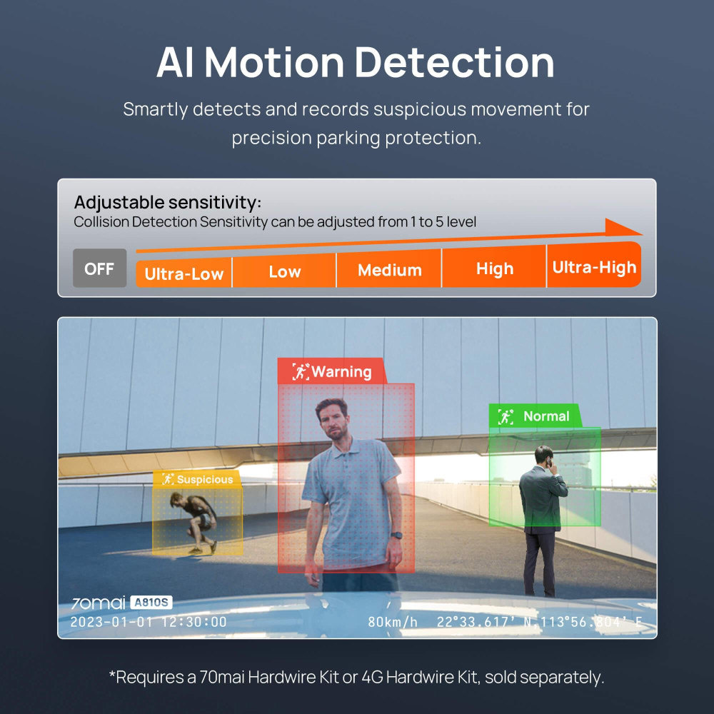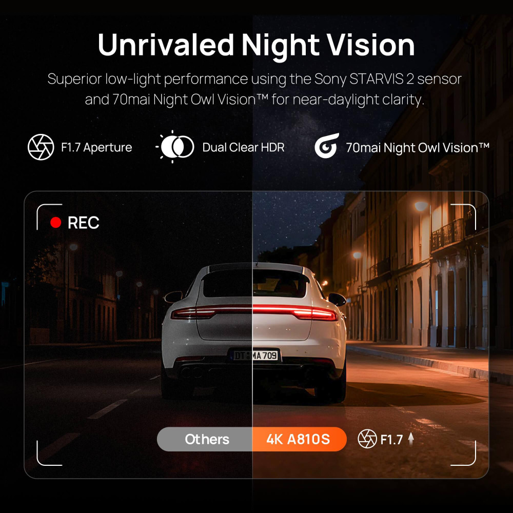 70mai A810S. HD type: 4K Ultra HD, Main camera resolution: 3840 x 2160 pixels, Main camera viewing angle: 146°. Display: IPS, Display diagonal: 7.62 cm (3). Compatible memory cards: MicroSD (TransFlash), Maximum memory card size: 512 GB. Wi-Fi standards: Wi-Fi 6 (802.11ax). Width: 89.1 mm, Depth: 37.3 mm, Height: 59.8 mm
