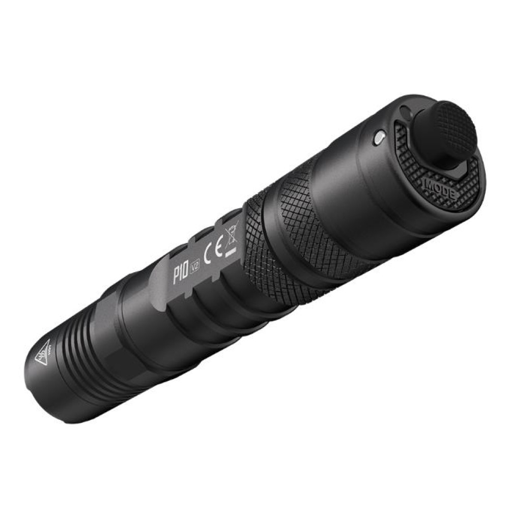 Summary Nitecore P10 V2. Тип фонаря: Tactical flashlight, Цвет товара: Черный, Материал корпуса: Алюминий. Водонепроницаемость до: 1 m, Ударопрочен до: 2 m, International Protection (IP) код: IP68. Тип лампы: LED, Количество ламп: 1 лампы, Светоотдача (мин): 60 lm. Тип батареек: 18650/CR123, Время работы батареи (макс): 55 h. Высота: 148,3 mm, Вес: 95 g, Диаметр головки: 2,54 cm