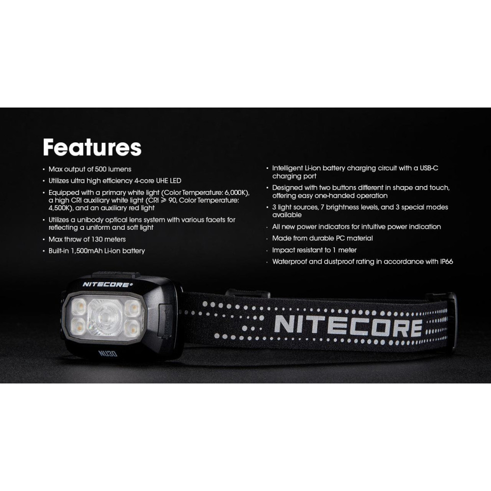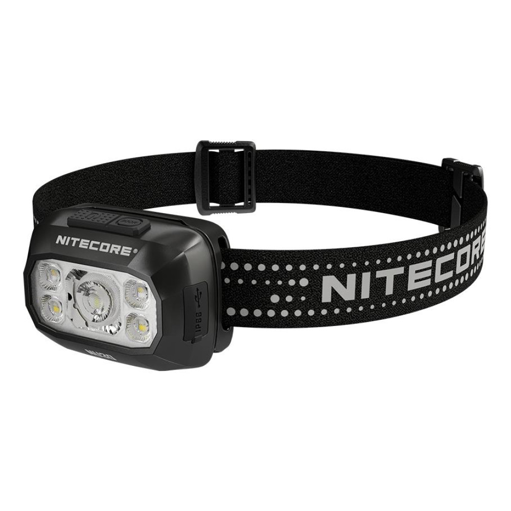 Nitecore 500 Lumen USB-C Rechargeable Outdoor Headlamp. Flashlight type: Headband flashlight, Product colour: Black, Housing material: Polycarbonate (PC). International Protection (IP) code: IP66. Lamp type: LED, Lamps quantity: 4 lamp(s), Light output (min): 100 lm. Battery type: Built-in battery, Battery technology: Lithium-Ion (Li-Ion), Battery capacity: 1500 mAh. Width: 45.2 mm, Depth: 62.2 mm, Height: 31 mm