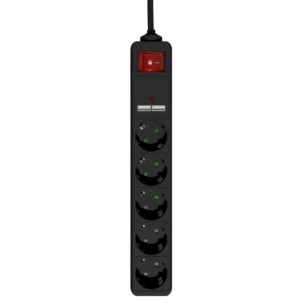 Gembird SPG5-U2-5-02. Cable length: 1.5 m, Placement supported: Indoor, Product colour: Black. AC outlets quantity: 5 AC outlet(s). AC input voltage: 250 V, AC input frequency: 50 - 60 Hz, Maximum current: 16 A. Width: 56 mm, Depth: 360 mm, Height: 41 mm. Package width: 55 mm, Package depth: 380 mm, Package height: 90 mm