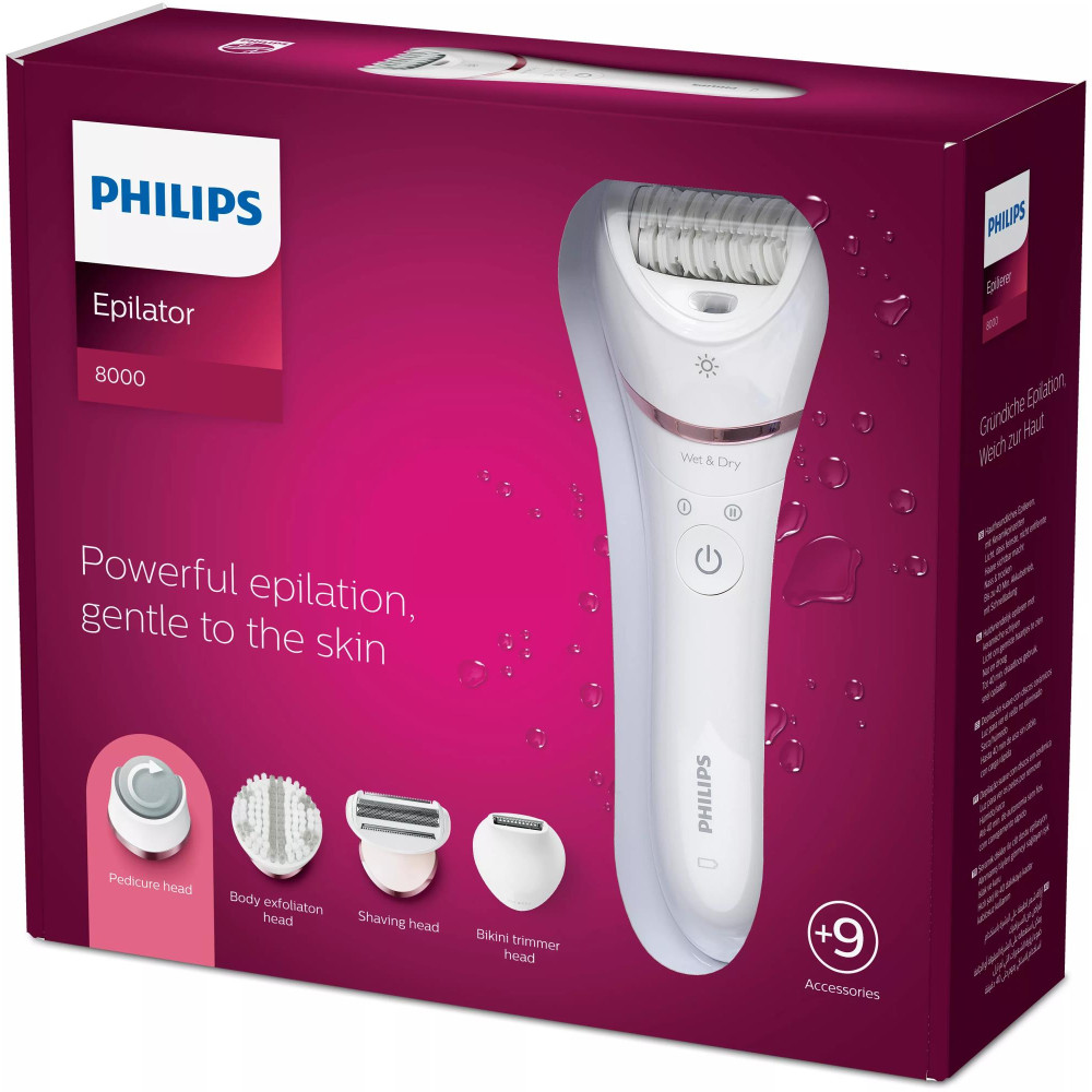 Philips Epilator Series 8000 BRE740/10 Wet and Dry epilator. Product colour: Pink, White, Body areas: Armpit, Back thigh, Bikini, Front thigh, Outer thigh, Interchangeable shaving heads: Epilation, Exfoliation, Shaving, Smoothing pedicure roller. Power source: Battery, AC input voltage: 15 V, Battery type: Built-in battery. Warranty period: 2 year(s). Weight: 407 g. Package type: Box