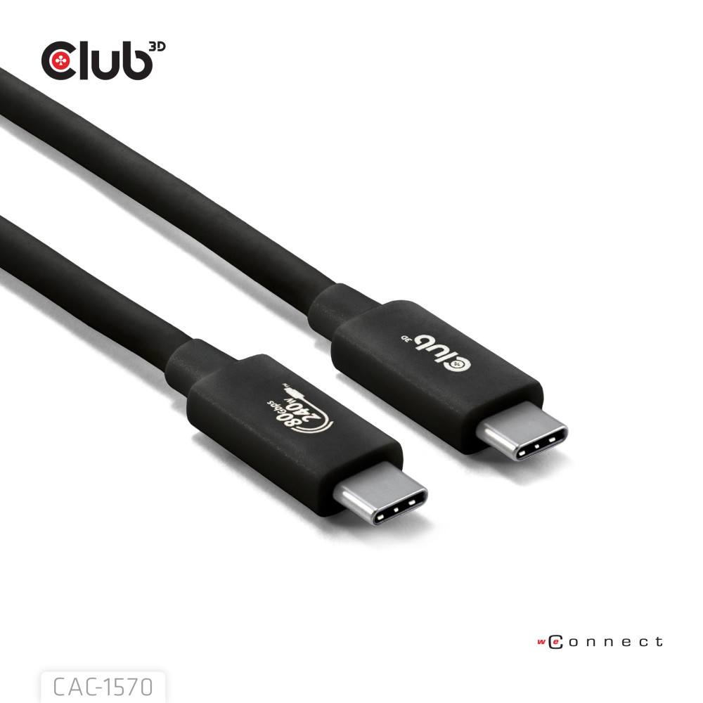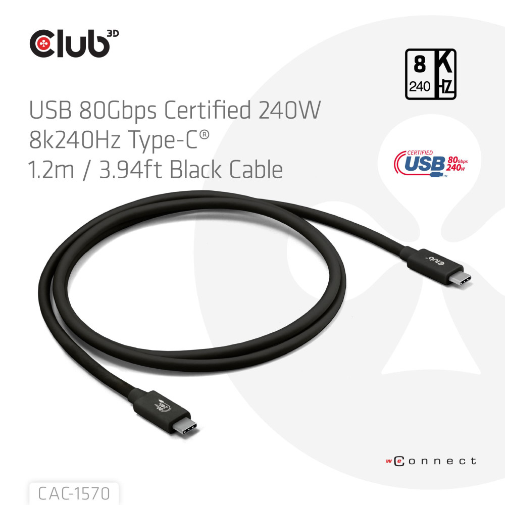 CLUB3D USB 80Gbps Certified 240W 8K240Hz Type-C® 1.2m / 3.94ft Black Cable. Cable length: 1.2 m. Connector 1: USB C, Connector 2: USB C, USB version: USB4 Gen 2x2, Maximum data transfer rate: 80 Gbit/s, Connector contacts plating: Nickel, Product colour: Black, Magnetically shielded