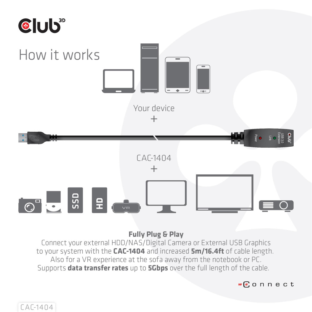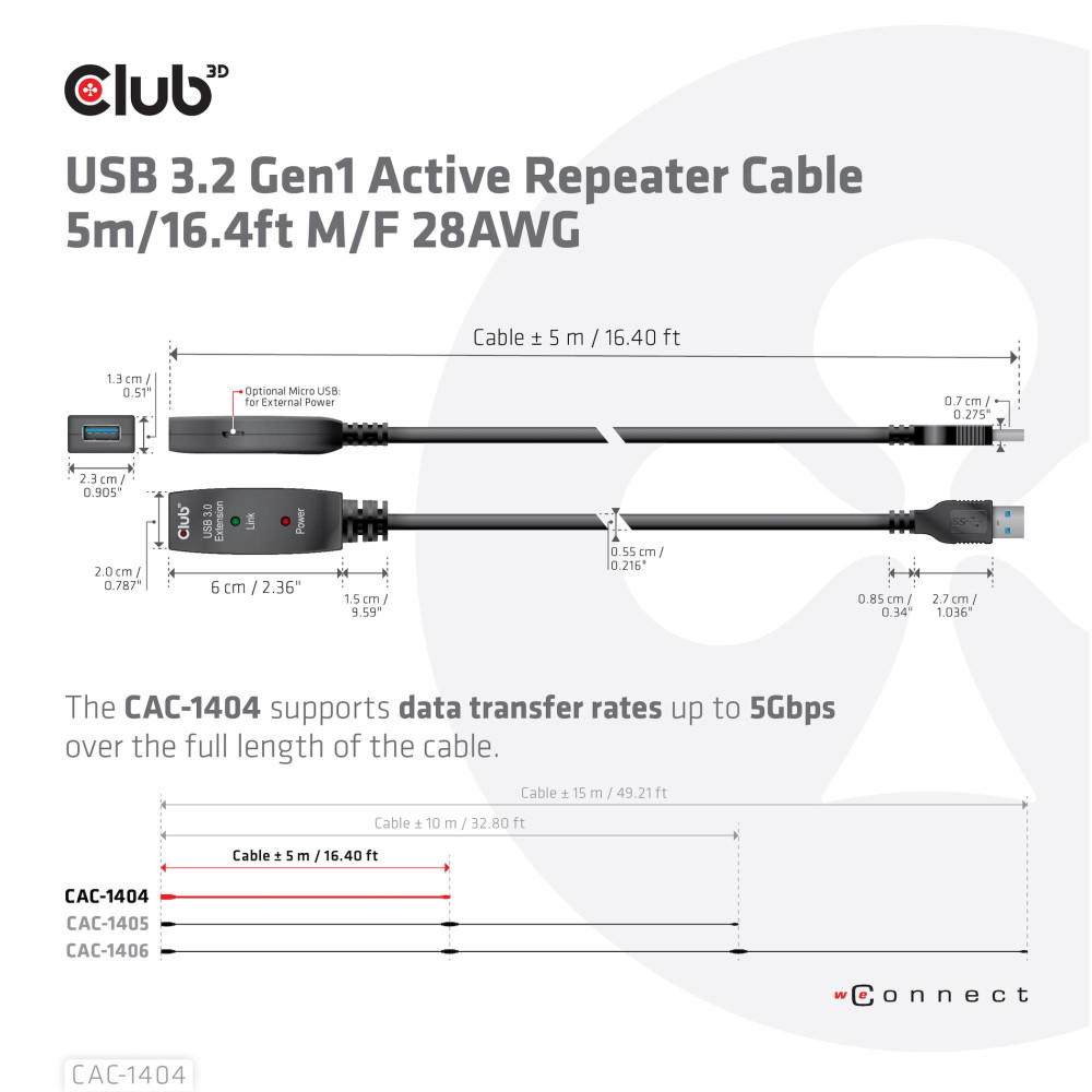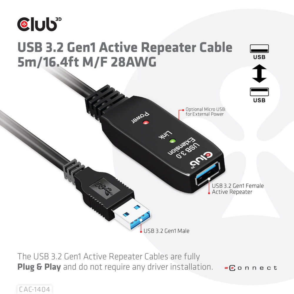 CLUB3D USB 3.2 Gen1 Active Repeater Cable 5m/ 16.4 ft M/F 28AWG. Cable length: 5 m. Connector 1: USB A, Connector 2: USB A, USB version: USB 3.2 Gen 1 (3.1 Gen 1), Maximum data transfer rate: 5 Gbit/s, Product colour: Black