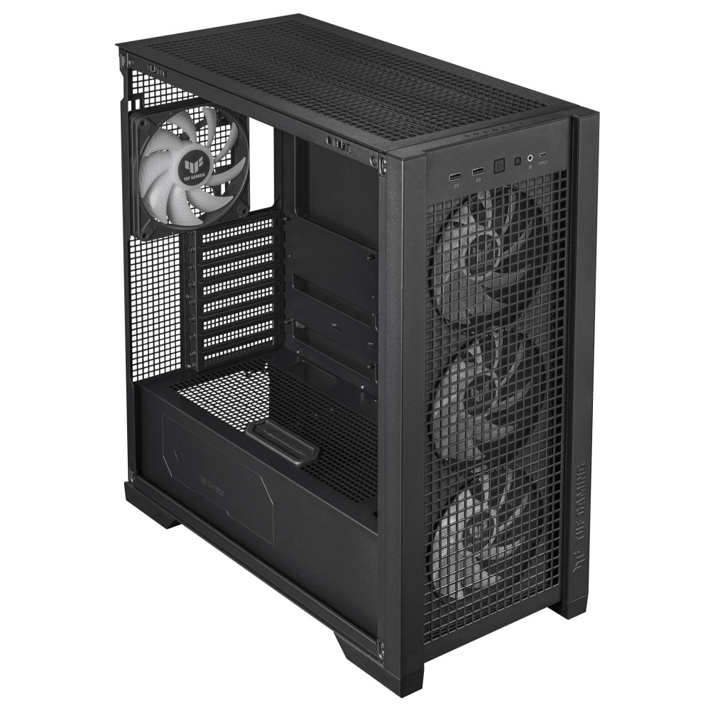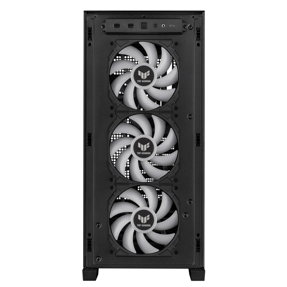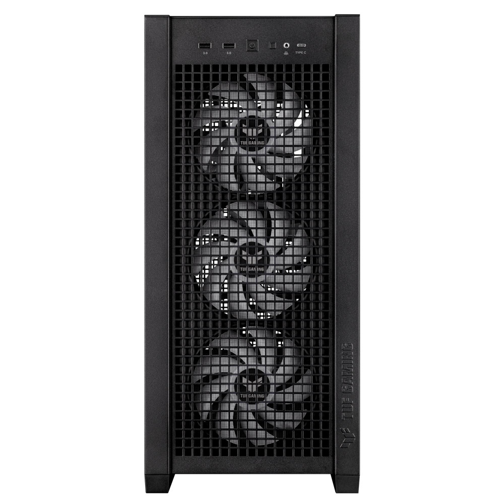 ASUS TUF Gaming GT302 ARGB. Form factor: Midi Tower, Type: PC, Product colour: Black. Front fans installed: 3x 140 mm, Front fans diameters supported: 140 mm, Rear fans installed: 1x 140 mm. Supported HDD sizes: 2.5,3.5. Width: 235 mm, Depth: 485 mm, Height: 520 mm. Package width: 592 mm, Package depth: 309 mm, Package height: 598 mm