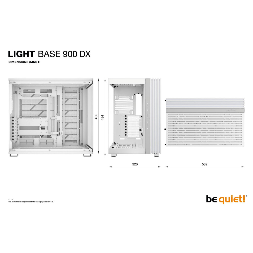 Summary be quiet! LIGHT BASE 900 DX White. Form factor: Full Tower, Type: PC, Product colour: White. Supported power supply form factors: ATX, PS2. Side fans diameters supported: 120,140 mm, Rear fans diameters supported: 120,140 mm, Top fans diameters supported: 120,140 mm. Supported HDD sizes: 2.5,3.5. Width: 327 mm, Depth: 532 mm, Height: 484 mm