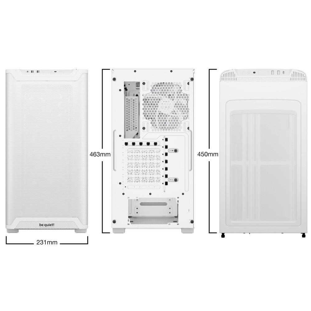 be quiet! Pure Base 501 LX White. Form factor: Midi Tower, Type: PC, Product colour: White. Supported power supply form factors: ATX, PS2. Front fans installed: 3x 120 mm, Front fans diameters supported: 120,140 mm, Rear fans installed: 1x 140 mm. Supported HDD sizes: 2.5,3.5. Width: 231 mm, Depth: 450 mm, Height: 463 mm