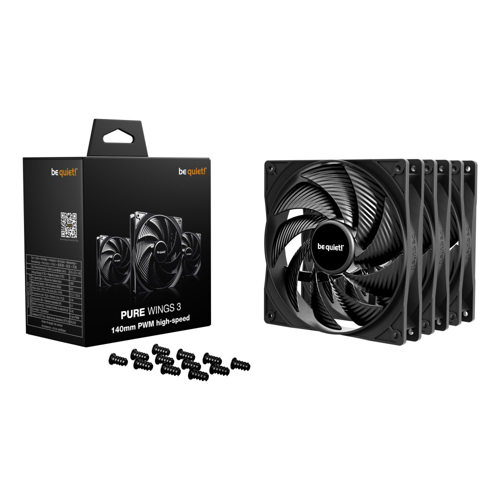 be quiet! Pure Wings 3 140 mm PWM high-speed Triple Pack. Тип: Вентилятор, Диаметр вентилятора: 14 cm, Скорость вращения (макс.): 1800 RPM, Воздушный поток: 122,6 m³/h, Максимальное давление воздуха: 2,44 mmH2O, Тип подшипника: Подшипник скольжения с винтовой нарезкой. Напряжение: 5 - 13.2 V. Цвет товара: Черный
