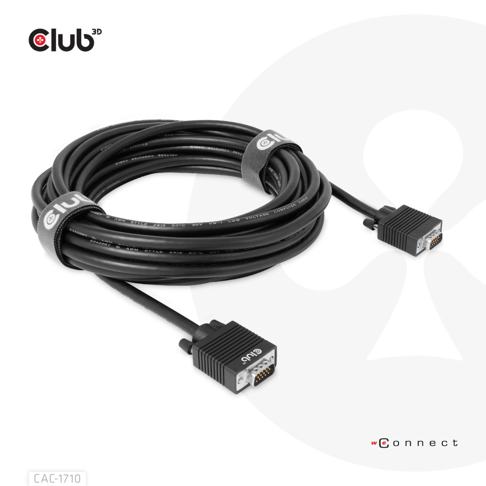 CLUB3D CAC-1710. Длина кабеля: 10 m, Разъем 1: VGA (D-Sub), Разъем 2: VGA (D-Sub). Сертификация: ROHS, FCC, CE EMI. Вес: 821 g. Количество в упаковке: 1 шт, Ширина упаковки: 230 mm, Глубина упаковки: 50 mm. Тип кабеля: Round cable