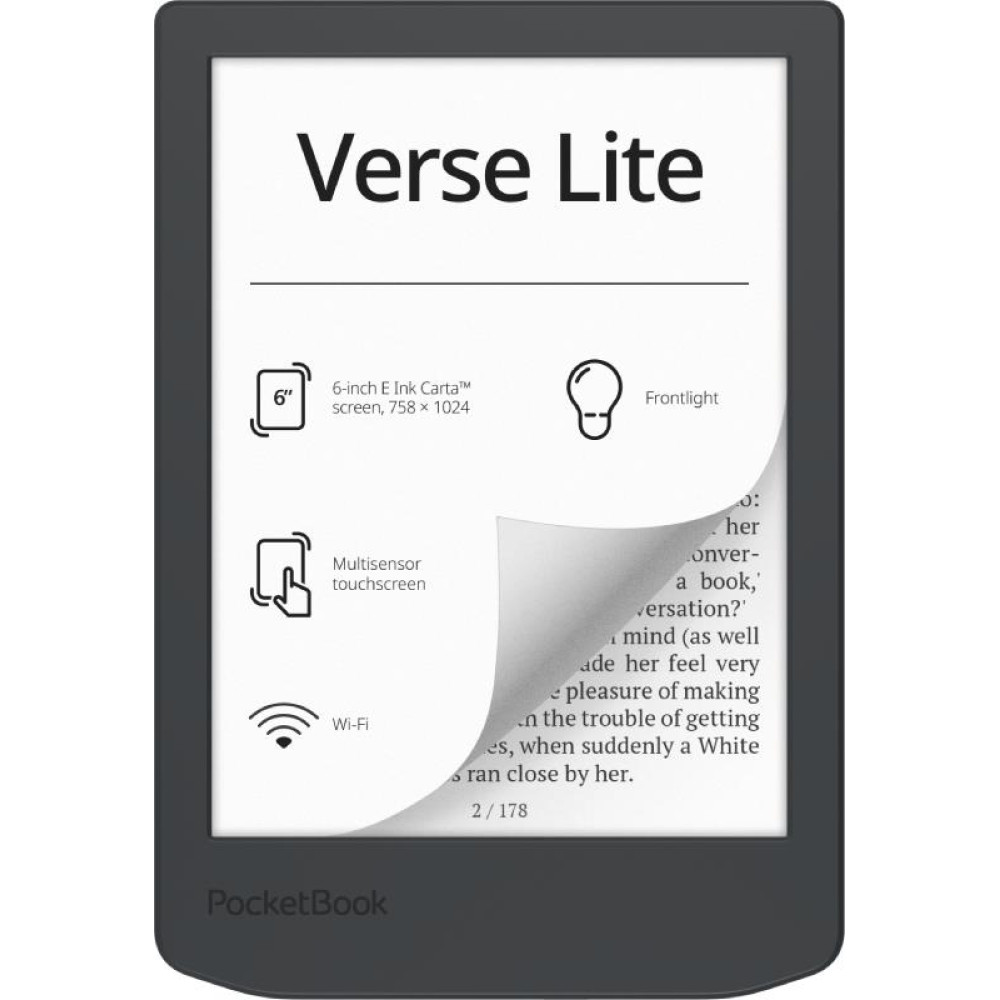 PocketBook Verse Lite. Display diagonal: 15.2 cm (6), Technology: E Ink Carta, Display resolution: 758 x 1024 pixels. Document formats supported: ACSM, AZW, AZW3, CBR, CBZ, CHM, DOC, DOCX, DjVu, EPUB, FB2, FB2.ZIP, HTM, HTML, MOBI, PDF, PRC,..., Image formats supported: BMP, JPEG, PNG, TIFF. Internal storage capacity: 8 GB, RAM capacity: 512 MB. USB connector type: USB Type-C. Product colour: Grey