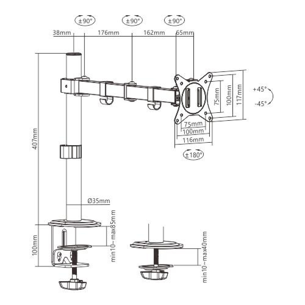 Gembird MA-D1-01. Mounting: Clamp, Maximum weight capacity: 9 kg, Minimum screen size: 43.2 cm (17), Maximum screen size: 81.3 cm (32), Minimum VESA mount: 75 x 75 mm, Maximum VESA mount: 100 x 100 mm. Height adjustment, Swivel angle range: -90 - 90°, Tilt angle range: -45 - 45°. Product colour: Black