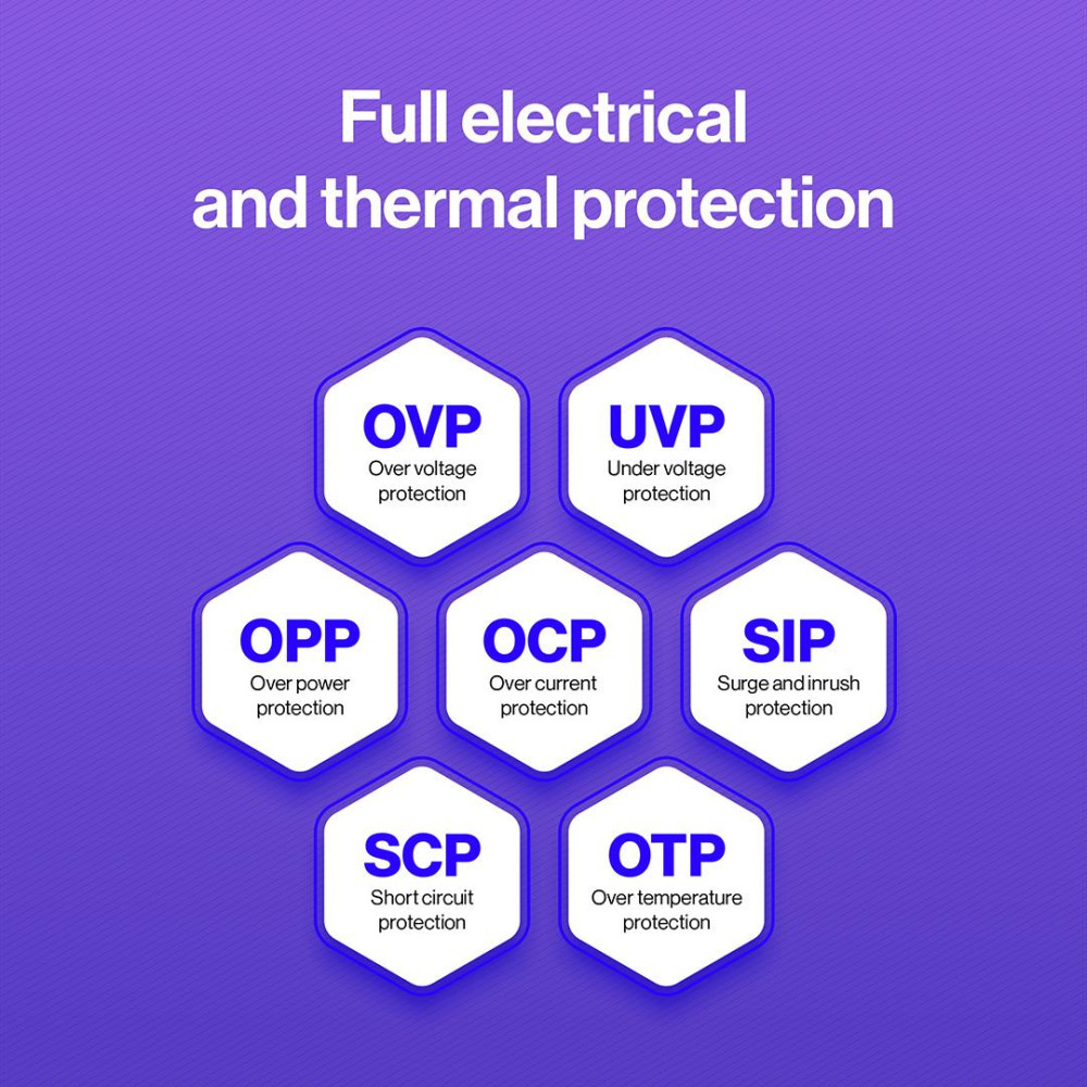 Surge & inrush protection (SIP)/Защита от перегрузки/Короткое замыкание/Перегревание/Перенапряжение/Пониженное напряжение/Сверхток