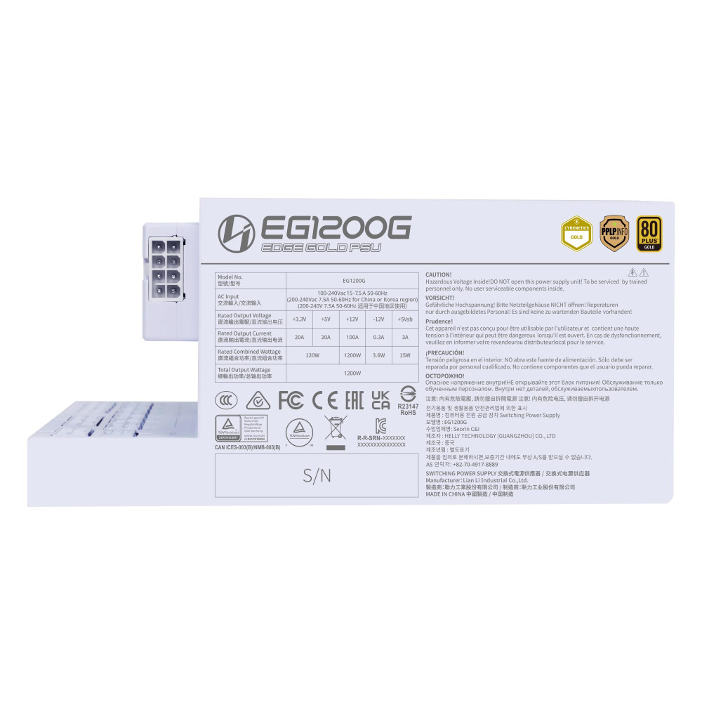 Power Supply, LIAN LI, EDGE GOLD 1200, 1200 Watts, Efficiency 80 PLUS GOLD, PFC Active, G9P.EG1200G.WH00.EU