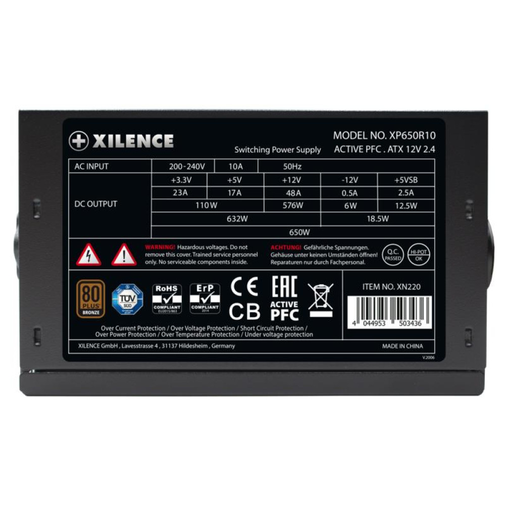 Summary Xilence XN225. Total power: 650 W, AC input voltage: 200 - 240 V, AC input frequency: 50 Hz. Motherboard power connector: 20+4 pin ATX, Motherboard power cable length: 50 cm, Cabling type: Non-Modular. Purpose: PC, Power supply unit (PSU) form factor: ATX, 80 PLUS certification: 80 PLUS Bronze. Product colour: Black, Red, Cooling type: Active, Fan diameter: 14 cm. Compliance certificates: CB, CE, REACH, RoHS, cTUVus, WEEE, Certification: ErP2014