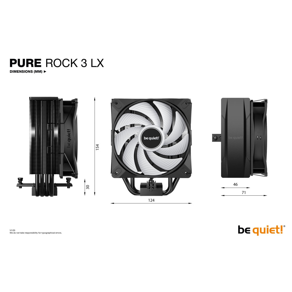 Summary be quiet! Pure Rock 3 LX. Type: Air cooler, Fan diameter: 12 cm, Rotational speed (max): 2000 RPM, Airflow: 105.1 m³/h, Maximum air pressure: 2.51 mmH2O, Bearing type: Rifle bearing. Width: 124 mm, Depth: 71 mm, Height: 154 mm. Product colour: Black