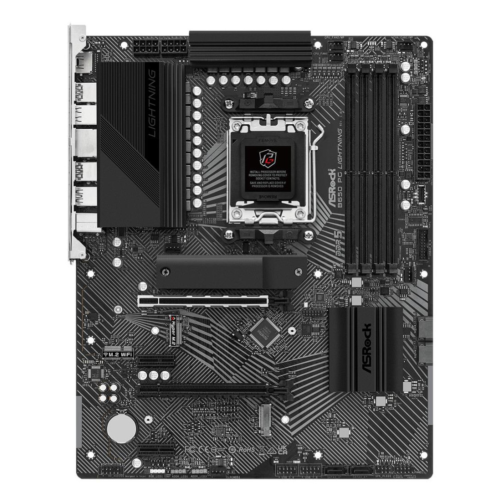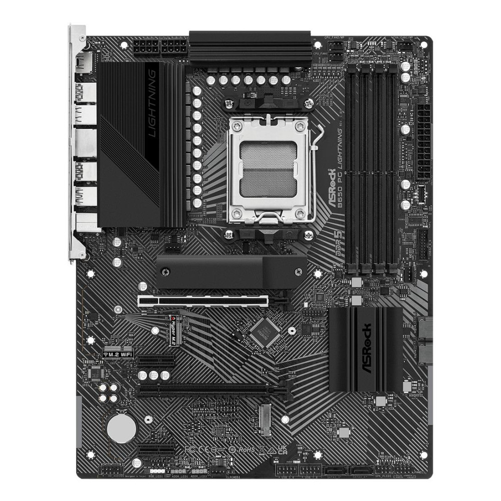 Asrock B650 PG Lightning. Производитель процессора: AMD, Сокет процессора: Socket AM5. Поддерживаемые типы памяти: DDR5-SDRAM, Максимальная внутренняя память: 128 GB, Тип слотов памяти: DIMM. Поддерживаемые интерфейсы носителя: M.2, SATA II, Поддерживаемые типы накопителей: HDD & SSD, Уровни RAID: 0, 1, 10. Семейство графического адаптера: AMD, Видеокарта: AMD RDNA 2. Тип Ethernet интерфейса: 2.5 Gigabit Ethernet, Контроллер LAN: Dragon RTL8125BG, Основной стандарт Wi-Fi: Wi-Fi 6E (802.11ax)