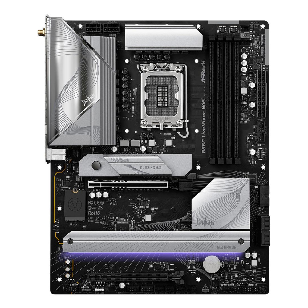 Asrock B860 LiveMixer WiFi. Производитель процессора: Intel, Сокет процессора: LGA 1851 (Socket V1), Совместимые серии процессоров: Intel Core Ultra (Series 2). Поддерживаемые типы памяти: DDR5-SDRAM, Максимальная внутренняя память: 256 GB, Тип слотов памяти: DIMM. Поддерживаемые интерфейсы носителя: PCI Express 4.0, PCI Express 5.0, SATA III, Поддерживаемые типы накопителей: HDD & SSD, Уровни RAID: 0, 1, 5, 10. Максимальное разрешение: 7680 x 4320 пикселей. Тип USB коннектора: USB тип-A, USB Type-C