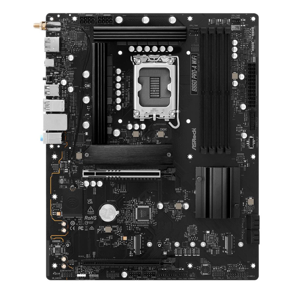 Asrock B860 Pro-A WiFi. Производитель процессора: Intel, Сокет процессора: LGA 1851 (Socket V1). Поддерживаемые типы памяти: DDR5-SDRAM, Максимальная внутренняя память: 256 GB, Тип слотов памяти: DIMM. Поддерживаемые интерфейсы носителя: M.2, SATA III, Уровни RAID: 0, 1, 5, 10. Семейство графического адаптера: Intel. Тип Ethernet интерфейса: 2.5 Gigabit Ethernet, Контроллер LAN: Dragon RTL8125BG, Основной стандарт Wi-Fi: Wi-Fi 6E (802.11ax)