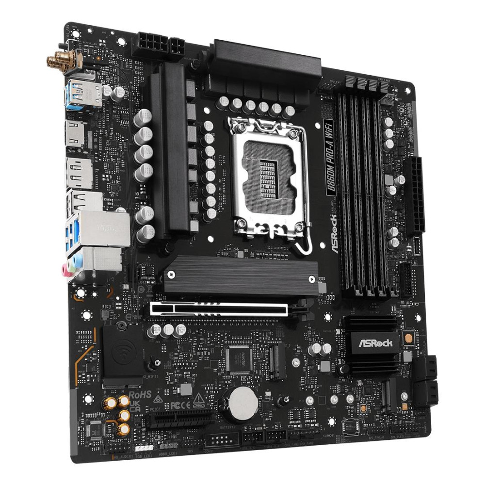 Asrock B860M Pro-A WiFi. Processor manufacturer: Intel, Processor socket: LGA 1851 (Socket V1). Supported memory types: DDR5-SDRAM, Maximum internal memory: 256 GB, Memory slots type: DIMM. Supported storage drive interfaces: M.2, SATA III, Supported storage drive types: HDD & SSD, RAID levels: 0, 5, 10. Ethernet interface type: 2.5 Gigabit Ethernet, LAN controller: Dragon RTL8125BG, Top Wi-Fi standard: Wi-Fi 6E (802.11ax). Component for: PC, Motherboard form factor: micro ATX, Motherboard chipset family: Intel