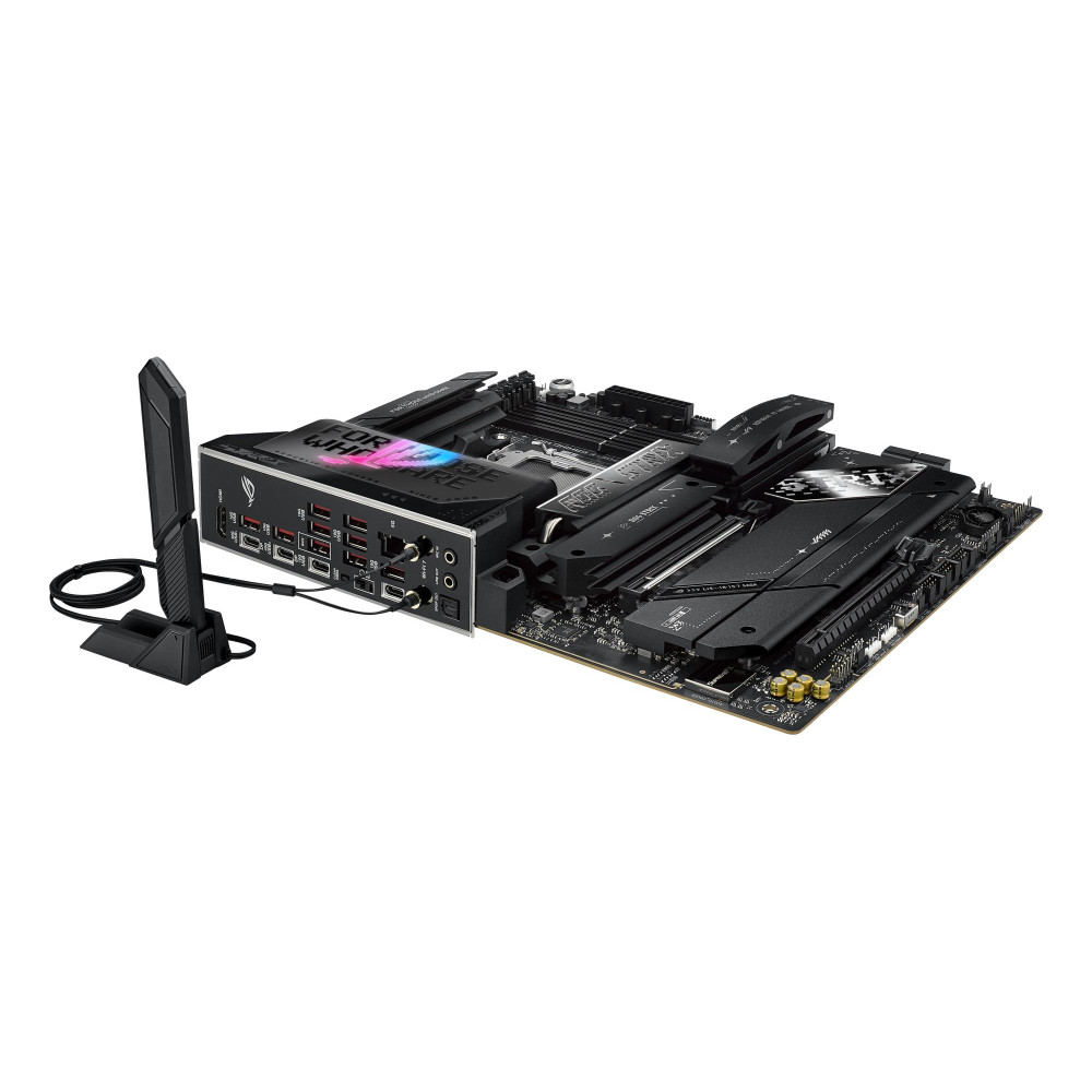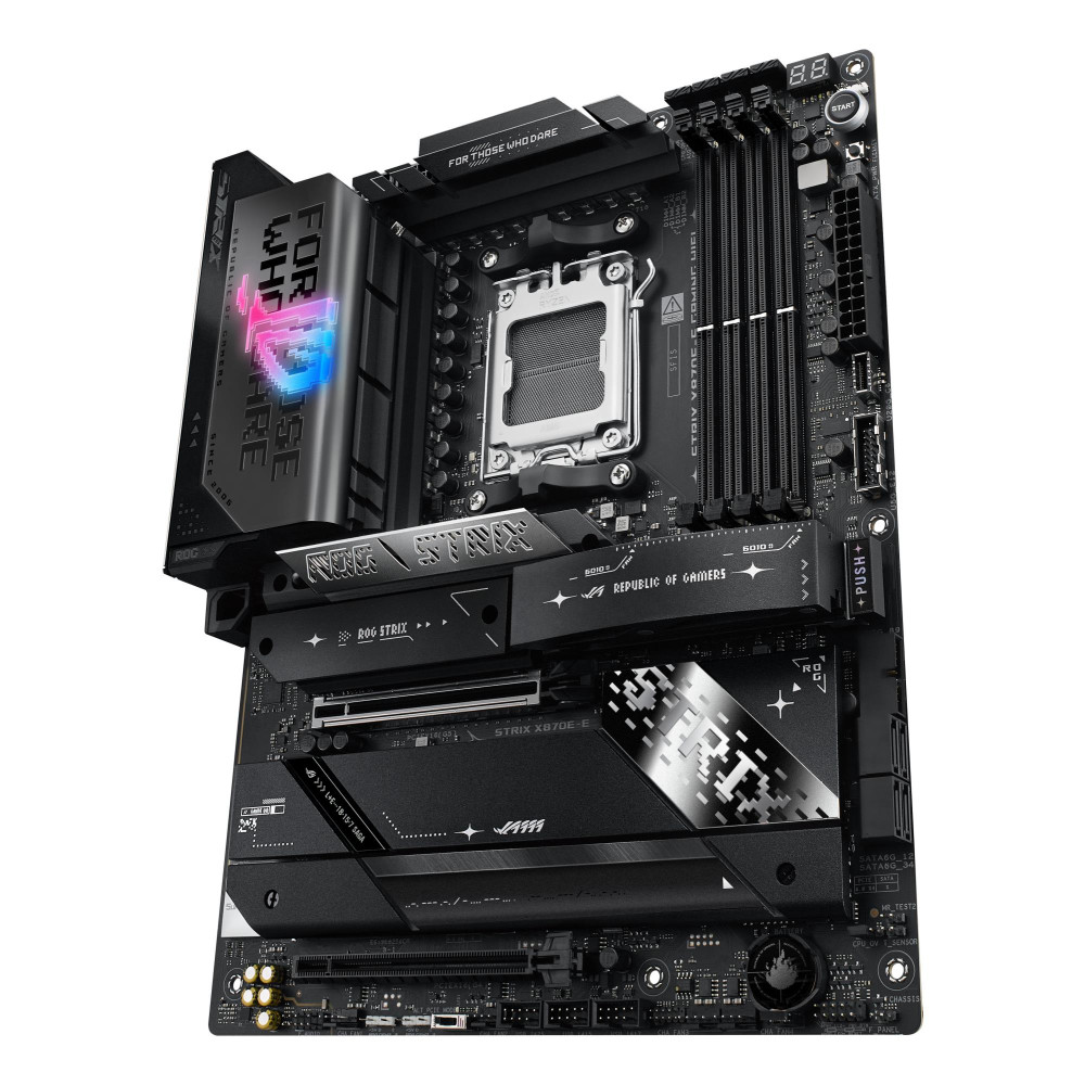 Summary ASUS ROG STRIX X870E-E GAMING WIFI. Processor manufacturer: AMD, Processor socket: Socket AM5, Supported processor sockets: Socket AM5. Supported memory types: DDR5-SDRAM, Maximum internal memory: 192 GB, Memory slots type: DIMM. Supported storage drive interfaces: M.2, SATA III, Supported storage drive types: HDD & SSD, RAID levels: 0, 1, 10, 5. Ethernet interface type: 5 Gigabit Ethernet, Top Wi-Fi standard: Wi-Fi 7 (802.11be), Wi-Fi standards: Wi-Fi 7 (802.11be). Component for: PC, Motherboard form factor: ATX, Motherboard chipset family: AMD