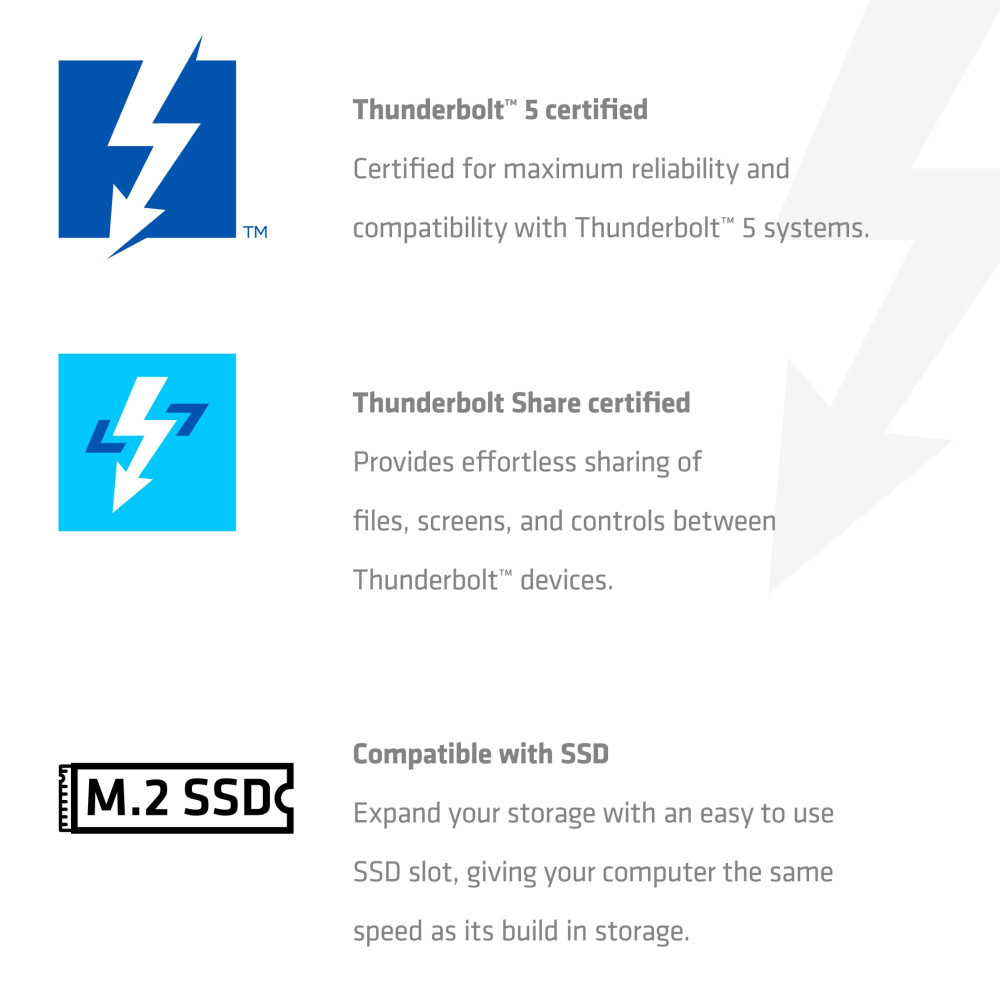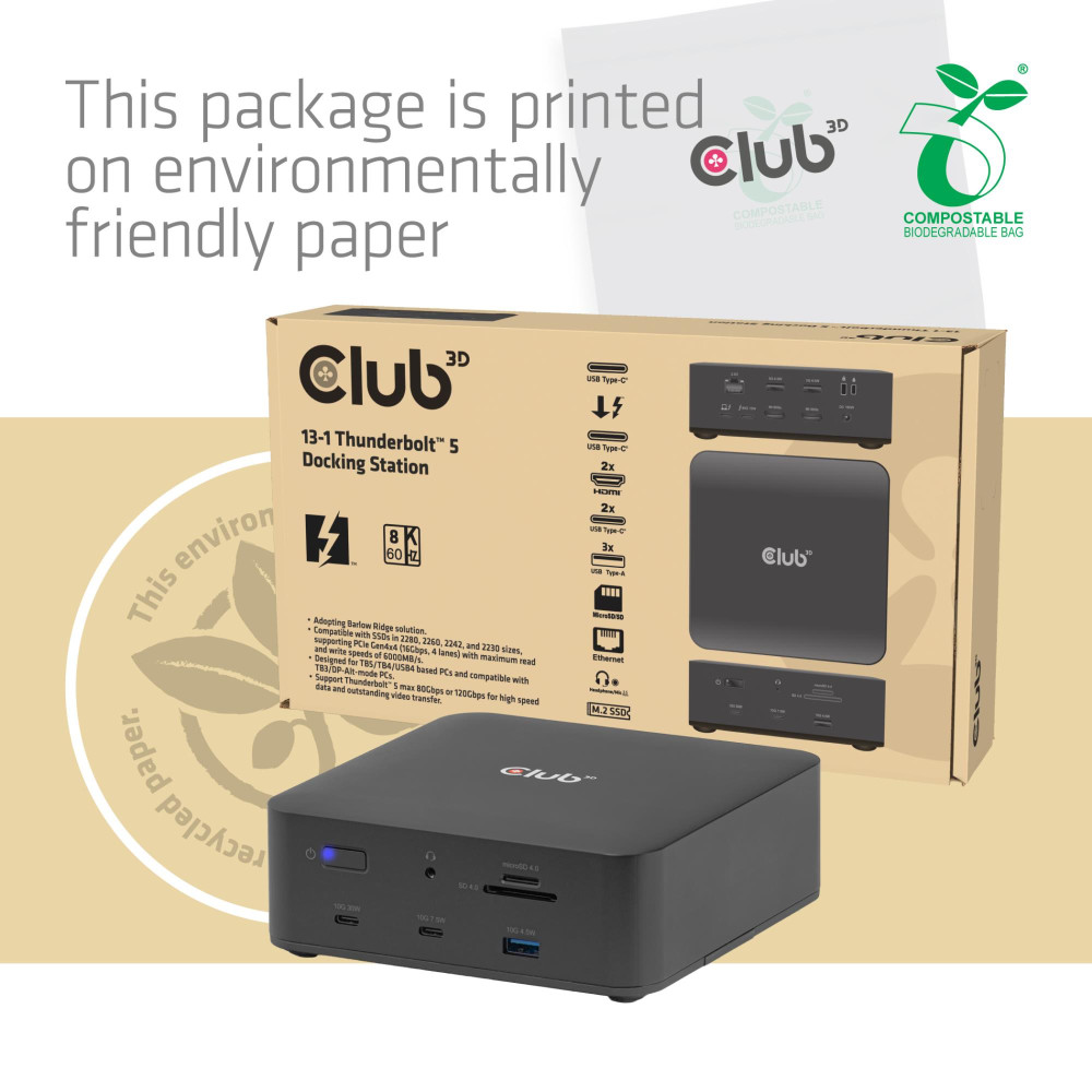 Summary CLUB3D CSV-2562 13-1 Thunderbolt™ 5 Docking Station M.2 SSD 2x HDMI™ 8K60Hz Thunderbolt™ Share Certified 180W. Connectivity technology: Wired, Host interface: Thunderbolt 5, USB Power Delivery up to: 140 W. Ethernet LAN data rates: 10,100,1000,2500 Mbit/s. Product colour: Black, Compatible memory cards: MicroSD Express, SD, Data transfer rate: 120 Gbit/s. Power source type: DC, Power supply: 180 W, USB cable length: 1 m. Sustainability certificates: SCS Product Category Rule (PCR)