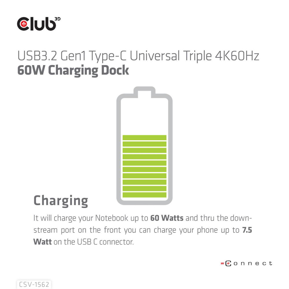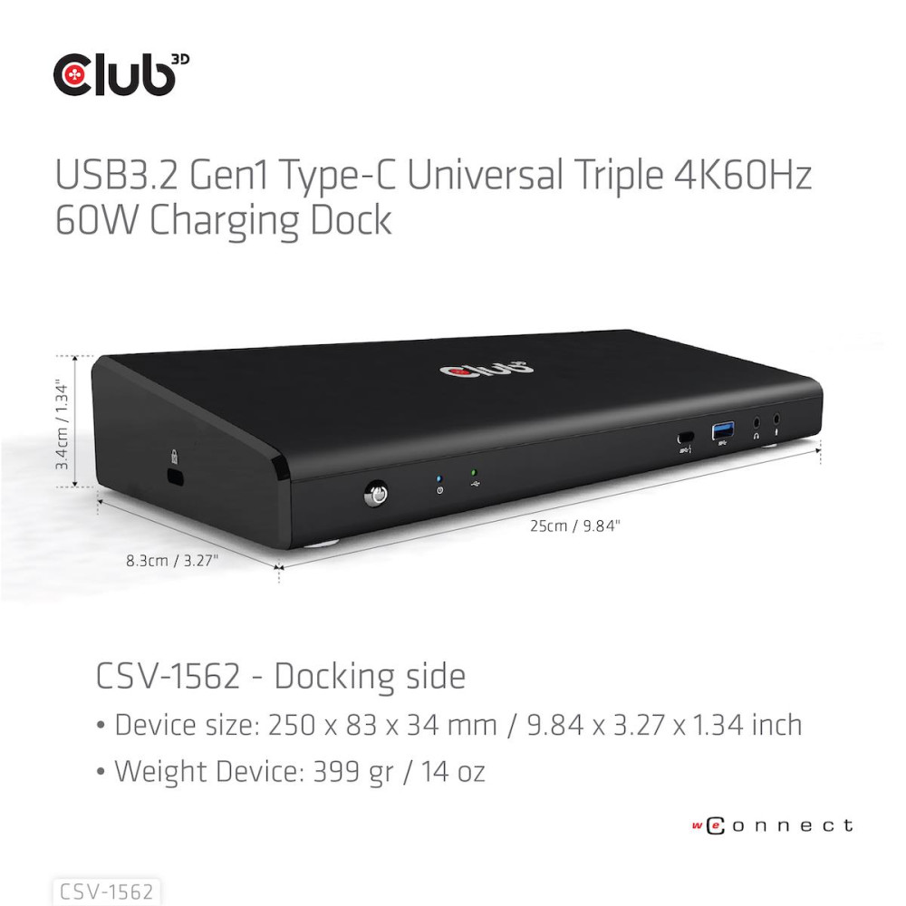 CLUB3D The CSV-1562 is an USB3.2 Gen1 Type-C Universal Triple 4K30Hz Charging Docking Station and is DisplayLink® Certified. The Universal Charging Dock. Connectivity technology: Docking, Host interface: USB 3.2 Gen 1 (3.1 Gen 1) Type-C, Headphone connectivity: 3.5 mm. Product colour: Black, LED indicators: Power, Country of origin: China. Windows operating systems supported: Windows 10, Windows 11. Width: 250 mm, Depth: 83 mm, Height: 43 mm. Package width: 298 mm, Package depth: 92 mm, Package height: 150 mm