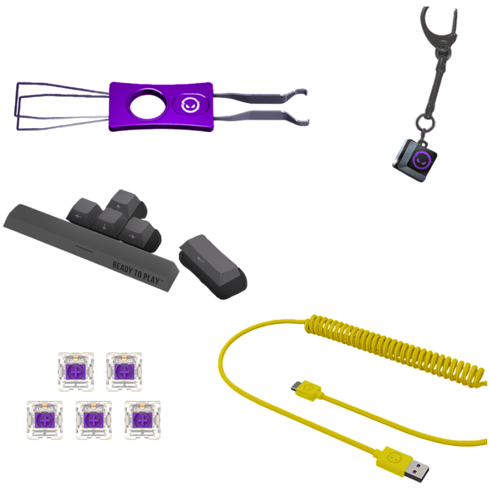 Ātrā lietošanas pamācība , Birstīte , Atslēgu piekariņš , Kausu paliktnis , Divi roku sildītāji , Pārnēsāšanas soma , Seši rezerves taustiņu vāciņi , Pieci rezerves slēdži , Slēdžu/ taustiņu vāciņu noņēmējs