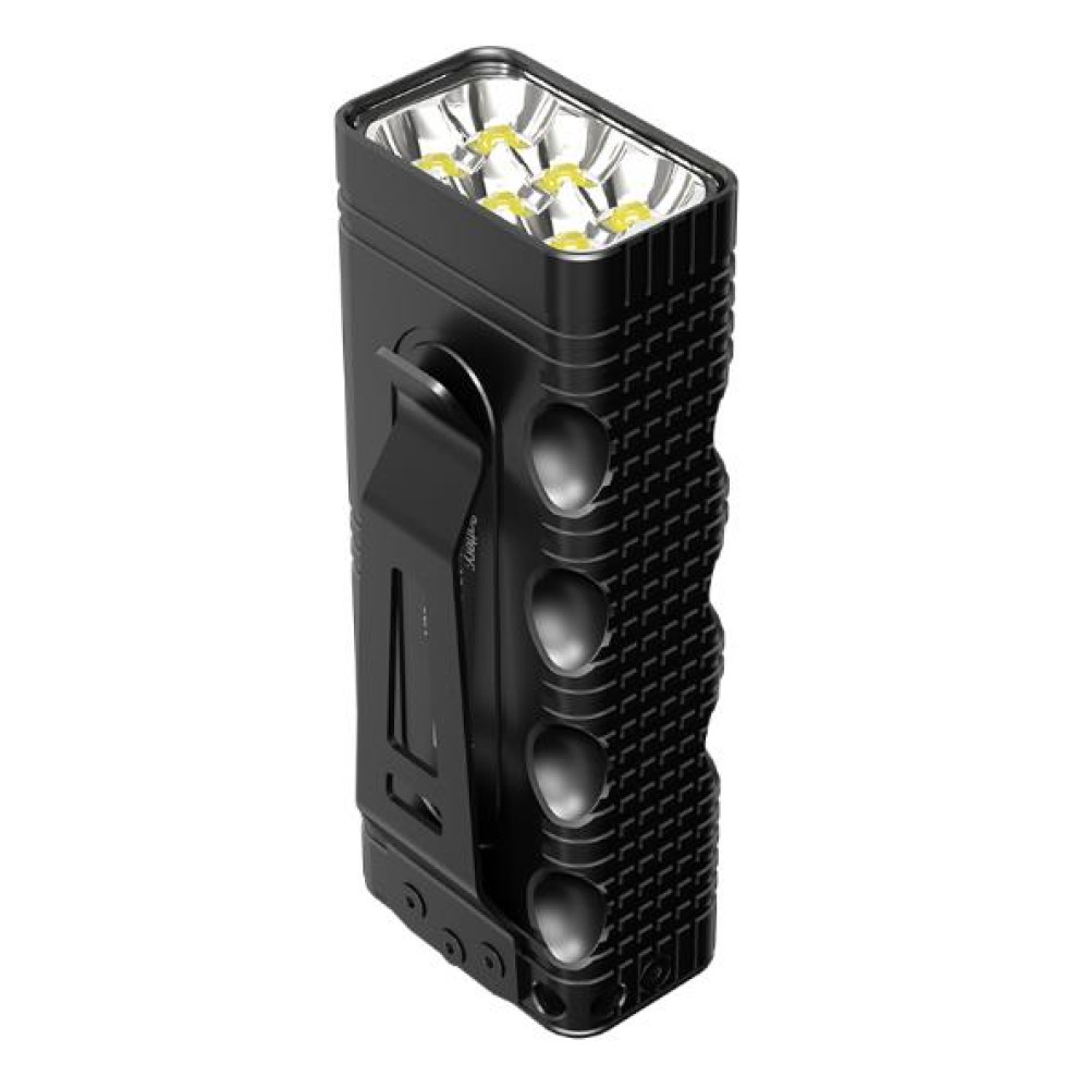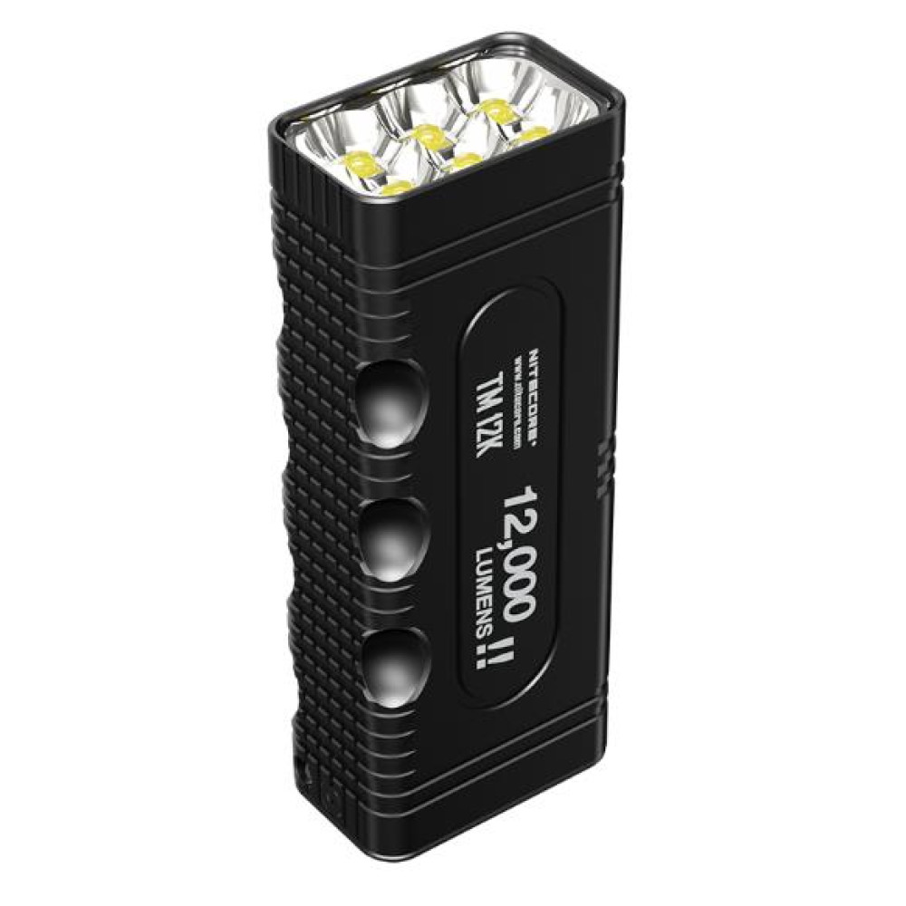 Nitecore TM12K. Flashlight type: Tactical flashlight, Product colour: Black, Housing material: Aluminium. Waterproof up to: 2 m, Shockproof up to: 1 m, International Protection (IP) code: IP68. Lamp type: LED, Lamps quantity: 6 lamp(s), Light output (min): 6 lm. Charging source: USB, Battery technology: Lithium-Ion (Li-Ion), Battery capacity: 4800 mAh. Width: 41 mm, Depth: 31 mm, Height: 108 mm