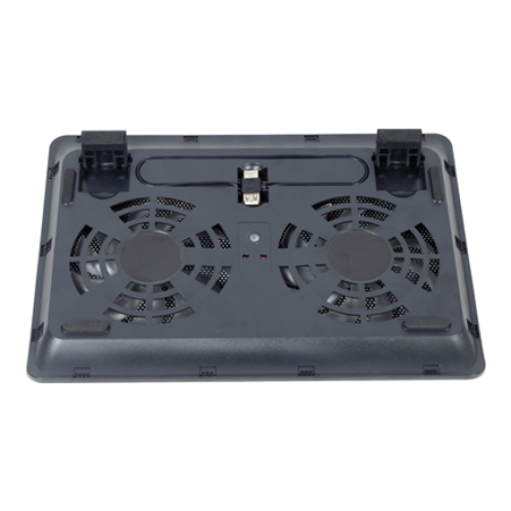 - Extra quiet cooling fans prolong your laptop life; LED light in fans for nice light effect under your notebook; Adjustable height for optimal viewing and typing angle; USB connector: passthrough type (in/out)