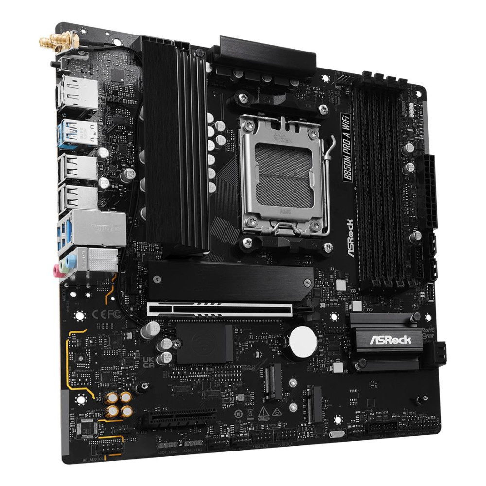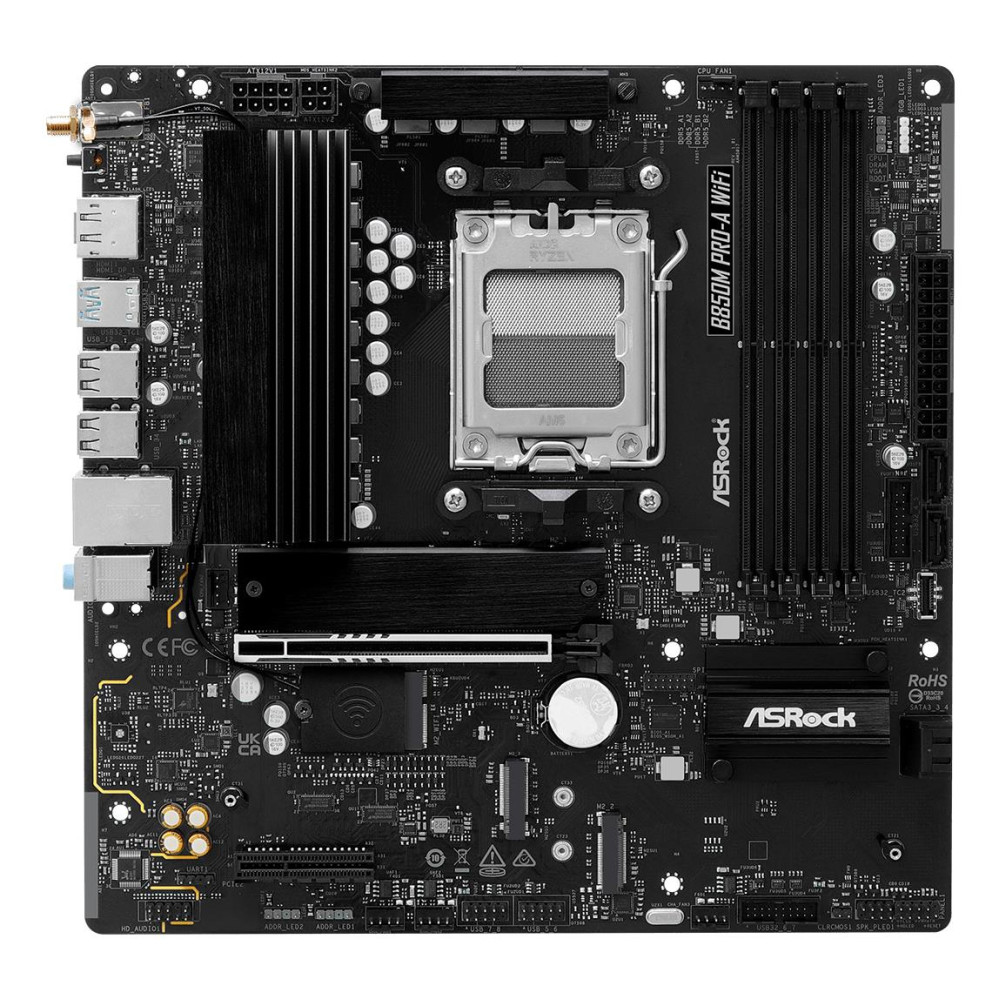 Asrock B850M Pro-A WiFi. Processor manufacturer: AMD, Processor socket: Socket AM5, Compatible processor series: AMD Ryzen 7000 Series, AMD Ryzen 8000 Series, AMD Ryzen 9000 Series. Supported memory types: DDR5-SDRAM, Maximum internal memory: 256 GB, Memory slots type: DIMM. Supported storage drive interfaces: PCI Express 4.0, PCI Express 5.0, SATA III, Supported storage drive types: HDD & SSD, RAID levels: 0, 1, 10. Maximum resolution: 3840 x 2160 pixels. USB connector type: USB Type-A, USB Type-C