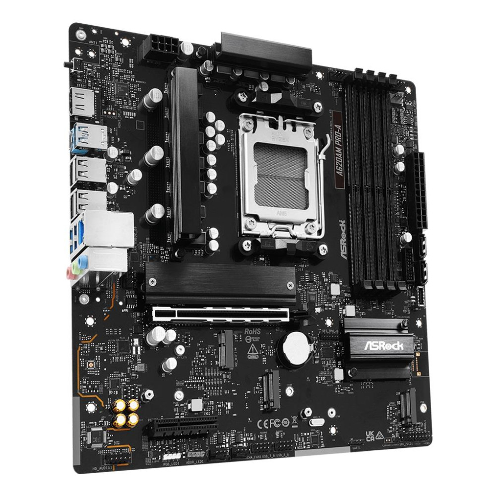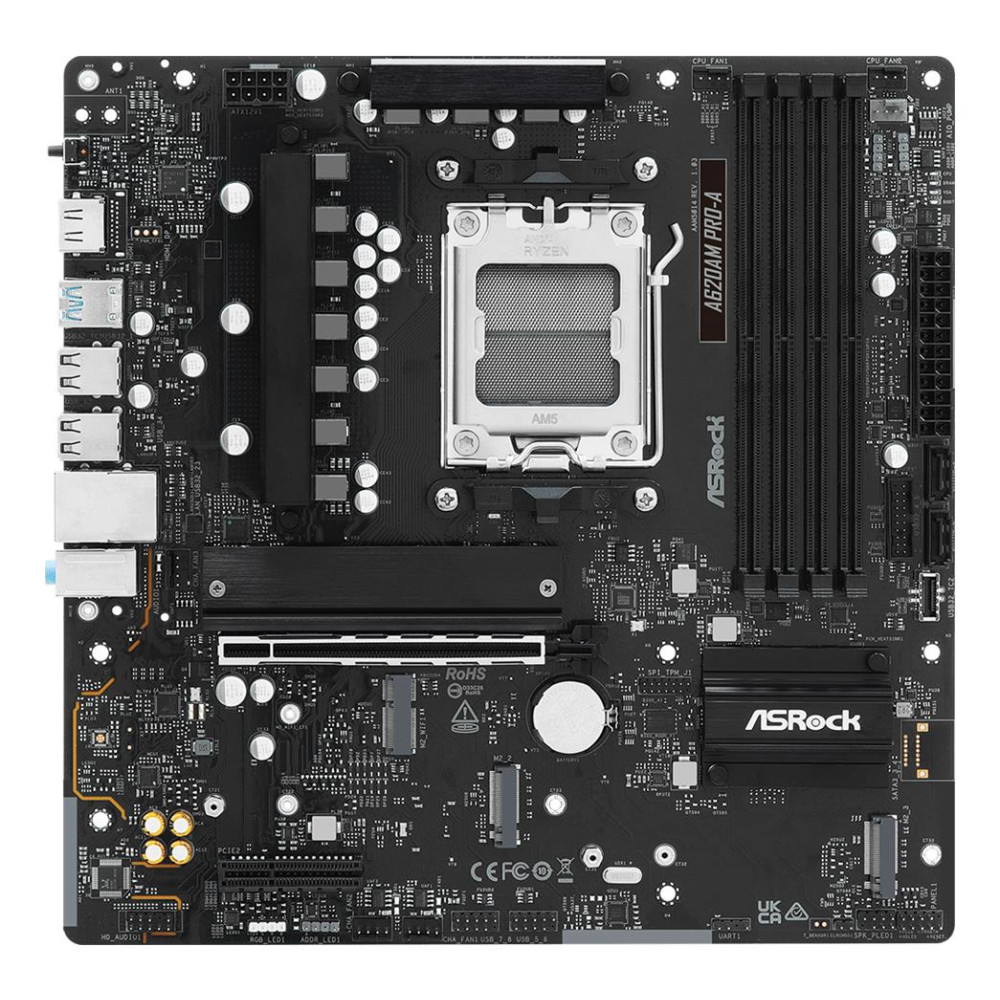 Asrock A620AM PRO-A. Processor manufacturer: AMD, Processor socket: Socket AM5, Compatible processor series: AMD Ryzen 7000 Series, AMD Ryzen 8000 Series, AMD Ryzen 9000 Series. Supported memory types: DDR5-SDRAM, Maximum internal memory: 256 GB, Memory slots type: DIMM. Supported storage drive interfaces: M.2, NVMe, SATA III, Supported storage drive types: HDD & SSD, RAID levels: 0, 1, 10. Graphics card family: AMD, Graphics card: AMD RDNA 2, Maximum resolution: 3840 x 2160 pixels. Ethernet interface type: 2.5 Gigabit Ethernet, Fast Ethernet, Gigabit Ethernet, LAN controller: Dragon RTL8125BG