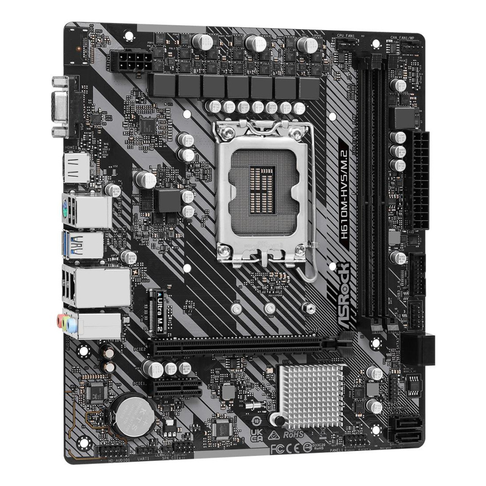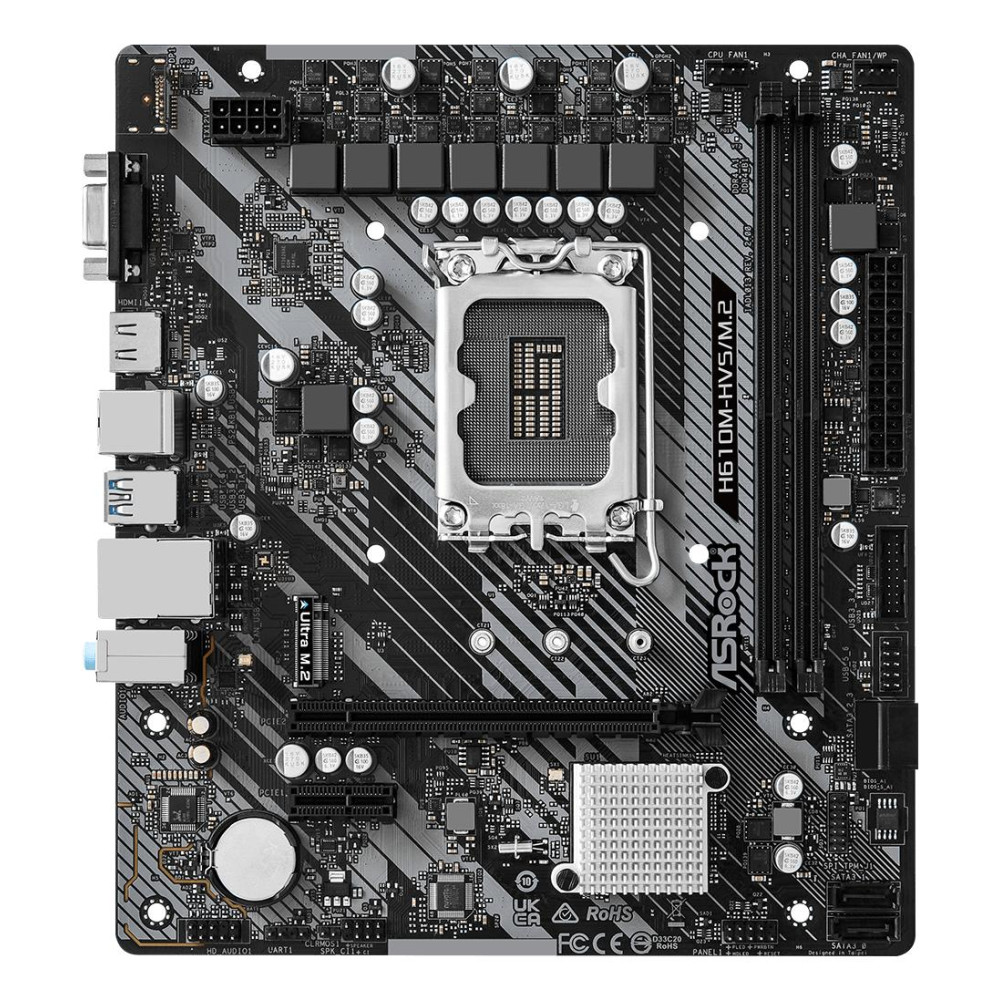 Summary Asrock H610M-HVS/M.2 R2.0. Processor manufacturer: Intel, Processor socket: LGA 1700, Compatible processor series: Intel® Core™ i3, Intel® Core™ i5, Intel® Core™ i7. Supported memory types: DDR4-SDRAM, Maximum internal memory: 64 GB, Memory slots type: DIMM. Supported storage drive interfaces: M.2, SATA III, Supported storage drive types: HDD & SSD. Maximum resolution: 4096 x 2160 pixels. Ethernet interface type: Gigabit Ethernet, LAN controller: Realtek RTL8111H