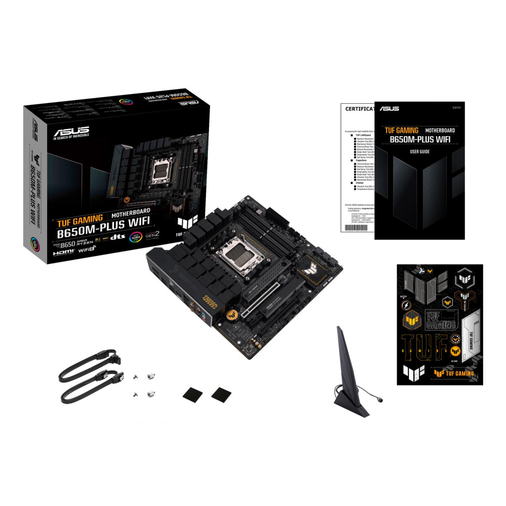 Summary ASUS TUF GAMING B650M-PLUS WIFI. Processor manufacturer: AMD, Processor socket: Socket AM5. Supported memory types: DDR5-SDRAM, Maximum internal memory: 128 GB, Memory slots type: DIMM. Supported storage drive interfaces: M.2, SATA III, Supported storage drive types: HDD & SSD, RAID levels: 0, 1, 10. Ethernet interface type: 2.5 Gigabit Ethernet, Fast Ethernet, Gigabit Ethernet, Top Wi-Fi standard: Wi-Fi 6 (802.11ax), Wi-Fi standards: 802.11a, 802.11b, 802.11g, Wi-Fi 4 (802.11n), Wi-Fi 5 (802.11ac), Wi-Fi 6 (802.11ax). Component for: PC, Motherboard form factor: micro ATX, Motherboard chipset family: AMD