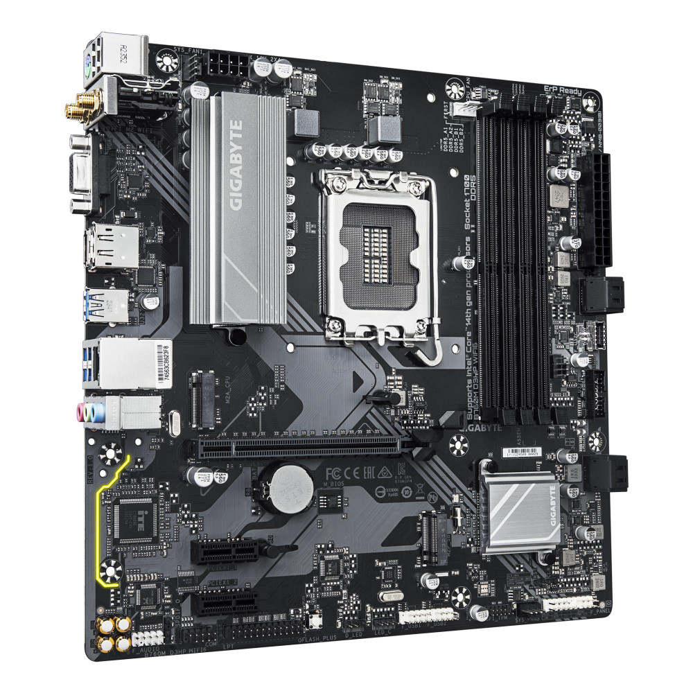 GIGABYTE B760M D3HP WIFI6 Motherboard - Supports Intel Core 14th Gen CPUs, 4+1+1 Phases Digital VRM, up to 5600MHz DDR5, 2xPCIe 4.0 M.2, Wi-Fi 6, GbE LAN, USB 3.2 Gen1. Processor manufacturer: Intel, Processor socket: LGA 1700, Compatible processor series: Intel® Celeron®, Intel Core i3 12th Gen, Intel Core i3 13th Gen, Intel Core i3 14th Gen, Intel.... Supported memory types: DDR5-SDRAM, Maximum internal memory: 192 GB, Memory slots type: DIMM. Supported storage drive interfaces: M.2, PCI Express 4.0, SATA III, Supported storage drive types: HDD & SSD, RAID levels: 0, 1, 5, 10. Maximum resolution: 4096 x 2304 pixels. Ethernet interface type: Gigabit Ethernet, LAN controller: Realtek RTL8111H, Top Wi-Fi standard: Wi-Fi 6 (802.11ax)