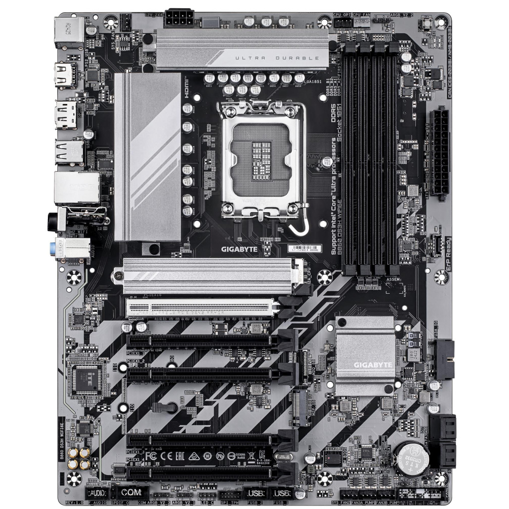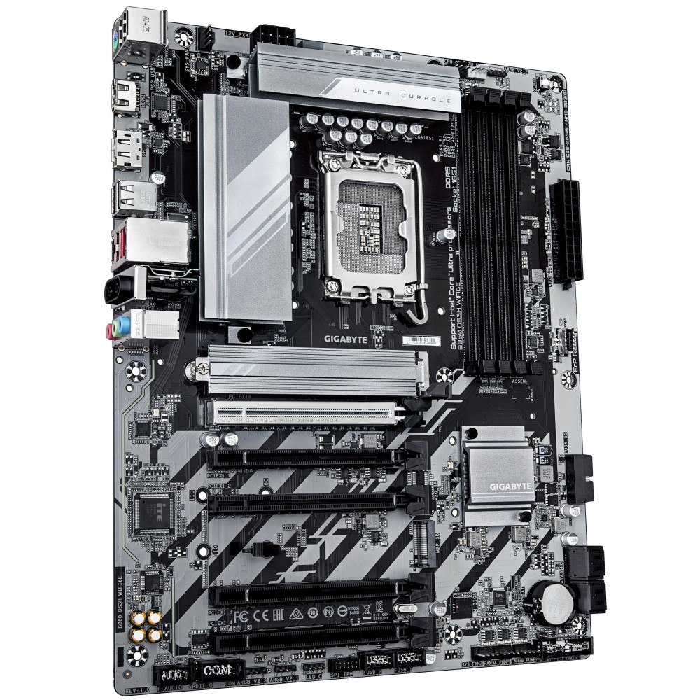 GIGABYTE B860 DS3H WIFI6E Motherboard - Intel Core Ultra Series CPUs, 8+1+2+2 Phases VRM, up to 9066MHz DDR5, 1xPCIe 5.0 + 1xPCIe 4.0 M.2, 2.5GbE LAN, WIFI 6E, USB 3.2 Gen 2x2. Processor manufacturer: Intel, Processor socket: LGA 1851 (Socket V1), Compatible processor series: Intel Core Ultra (Series 2). Supported memory types: DDR5-SDRAM, Maximum internal memory: 256 GB, Memory slots type: DIMM. Supported storage drive interfaces: M.2, SATA III, Supported storage drive types: HDD & SSD, RAID levels: 0, 1, 5, 10. Maximum resolution: 4096 x 2160 pixels. Ethernet interface type: 2.5 Gigabit Ethernet, LAN controller: Realtek RTL8125, Top Wi-Fi standard: Wi-Fi 6E (802.11ax)