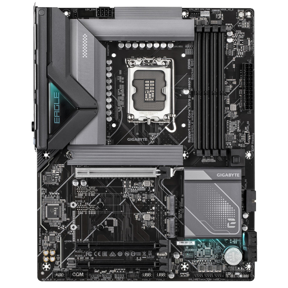 GIGABYTE B860 EAGLE WIFI6E Motherboard - Intel Core Ultra Series CPUs, 12+1+2+1 Phases VRM, up to 9066MHz DDR5, 1xPCIe 5.0 + 2xPCIe 4.0 M.2, 2.5GbE LAN, WIFI 6E, USB 3.2 Gen 2x2. Processor manufacturer: Intel, Processor socket: LGA 1851 (Socket V1), Compatible processor series: Intel® Core™ Ultra (Series 1), Intel Core Ultra (Series 2). Supported memory types: DDR5-SDRAM, Maximum internal memory: 256 GB, Memory slots type: DIMM. Supported storage drive interfaces: M.2, SATA III, Supported storage drive types: HDD & SSD, RAID levels: 0, 1, 5, 10. Maximum resolution: 4096 x 2160 pixels. Ethernet interface type: 2.5 Gigabit Ethernet, LAN controller: Realtek RTL8125D, Top Wi-Fi standard: Wi-Fi 6E (802.11ax)