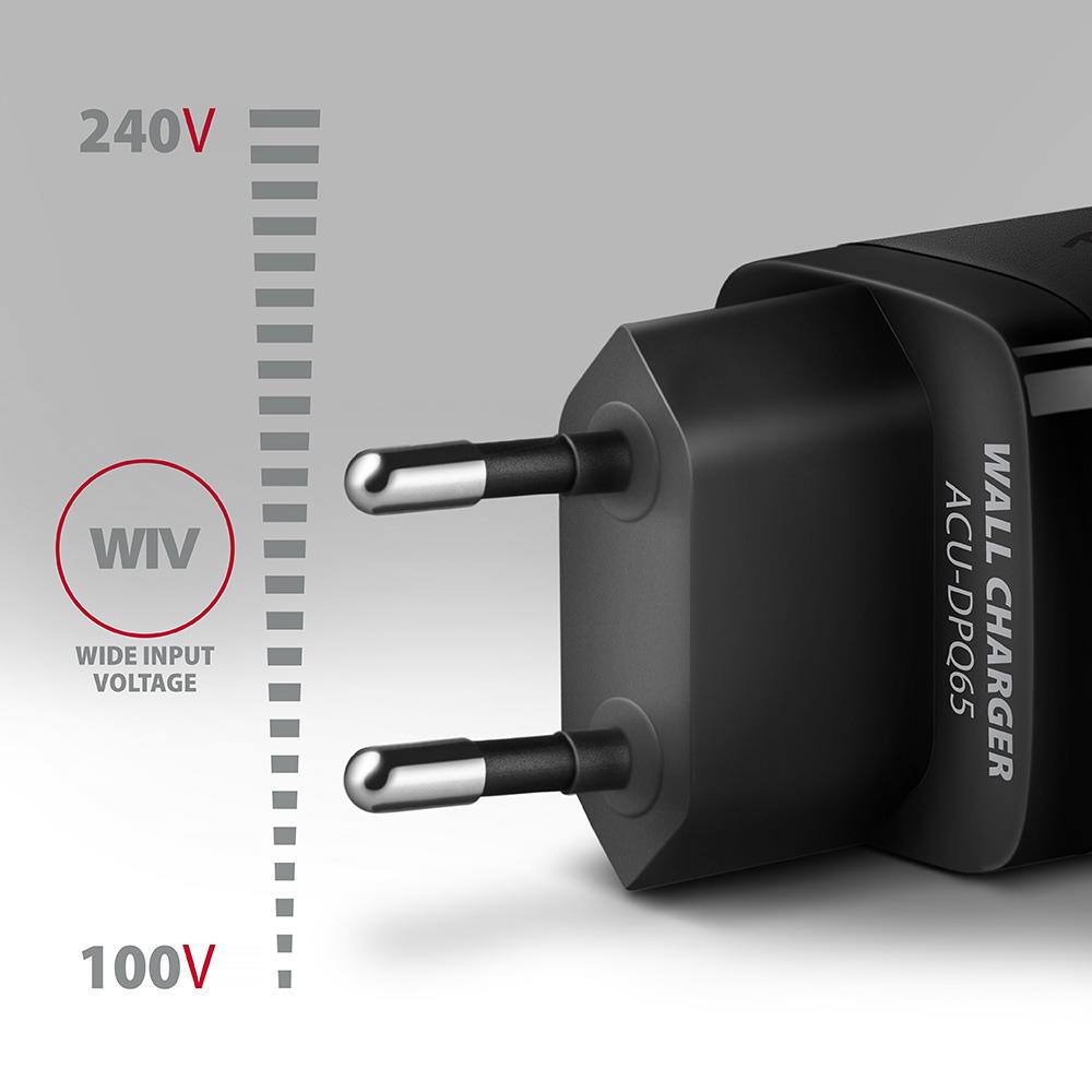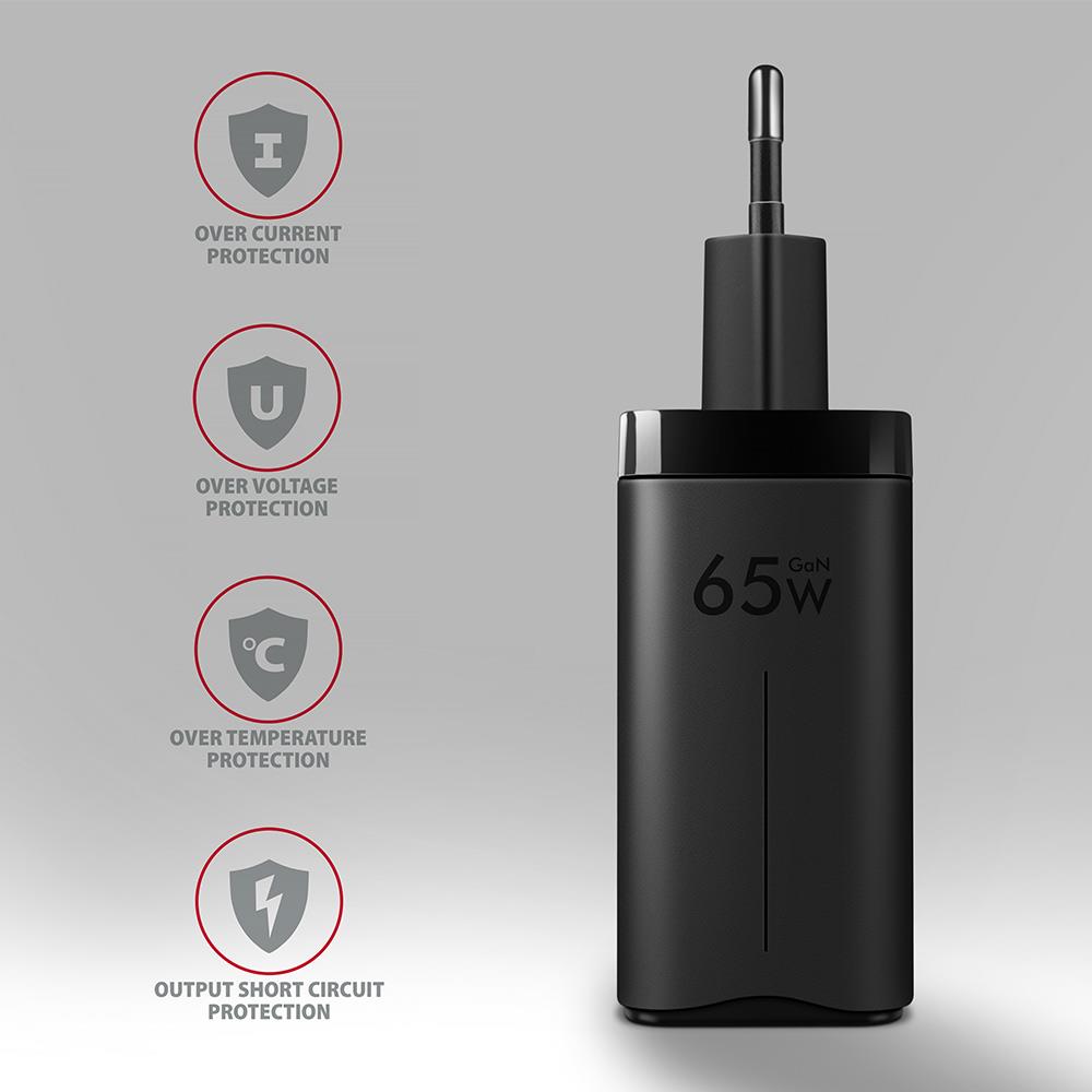 Summary Axagon ACU-DPQ65 GaN Wall charger 65W, 3x port (USB-A + dual USB-C), PD3.0/QC4+/PPS/Apple. Charger type: Indoor, Power source type: AC, Charger compatibility: Mobile phone, Netbook, Laptop, Smartphone, Smartwatch, Tablet, Universal. Input voltage: 100 - 240 V, Maximum output voltage: 20 V. USB 2.0 ports quantity: 1, USB Type-C ports quantity: 2, Fast charging, Power protection features: Over voltage, Overheating, Overload, Short circuit. Product colour: Black