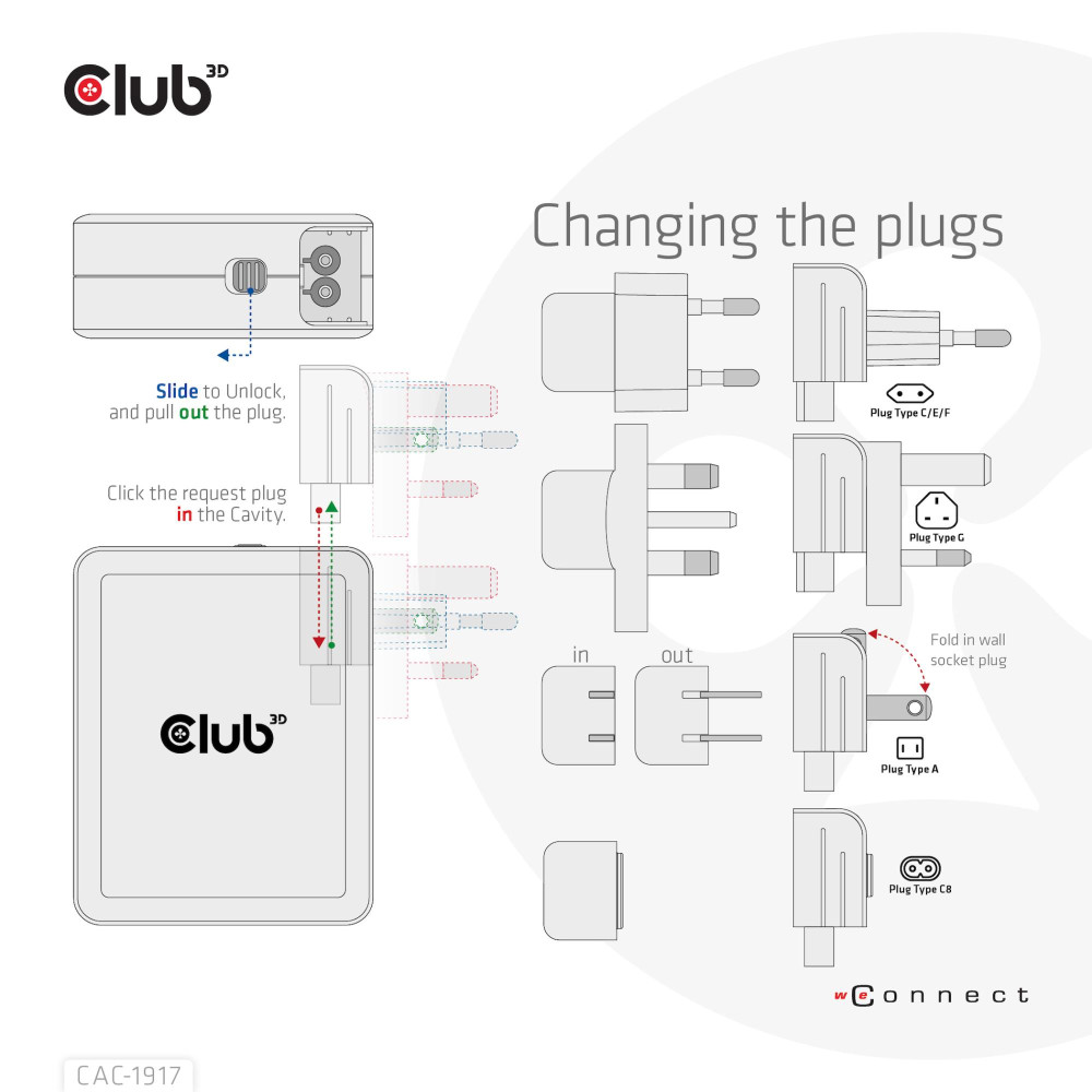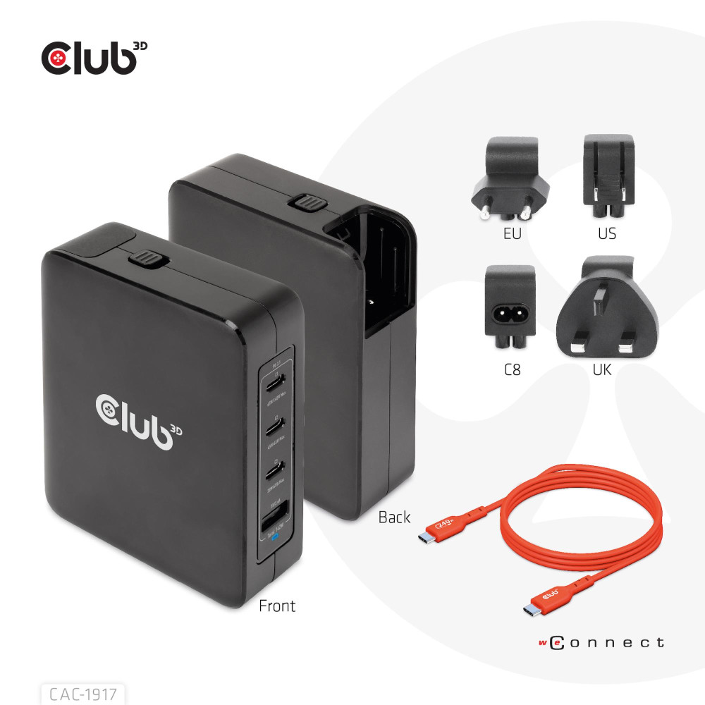 Summary CLUB3D International Travel Charger 140W GaN technology, Four port USB Type-A(1x) and -C(3x), PPS + Power Delivery(PD) 3.1 Support. Charger type: Indoor, Power source type: AC, Charger compatibility: Universal. Input voltage: 100 - 240 V, Maximum output voltage: 28 V. USB Type-C ports quantity: 3, Fast charging, Power protection features: Over current, Over voltage, Overheating, Short circuit. Product colour: Black