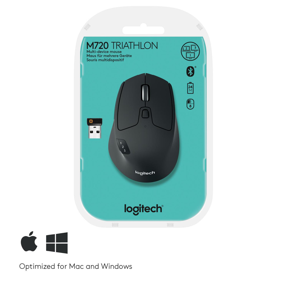 Logitech M720. Формат: Для правой руки. Датчик перемещения: Оптический, Интерфейс устройства: РЧ беспроводной + Bluetooth, Разрешительная способность движения: 1000 DPI, Тип кнопок: Нажимные кнопки, Количество кнопок: 8, Тип прокрутки: Колесико. Источник питания: Батарейки. Цвет товара: Черный