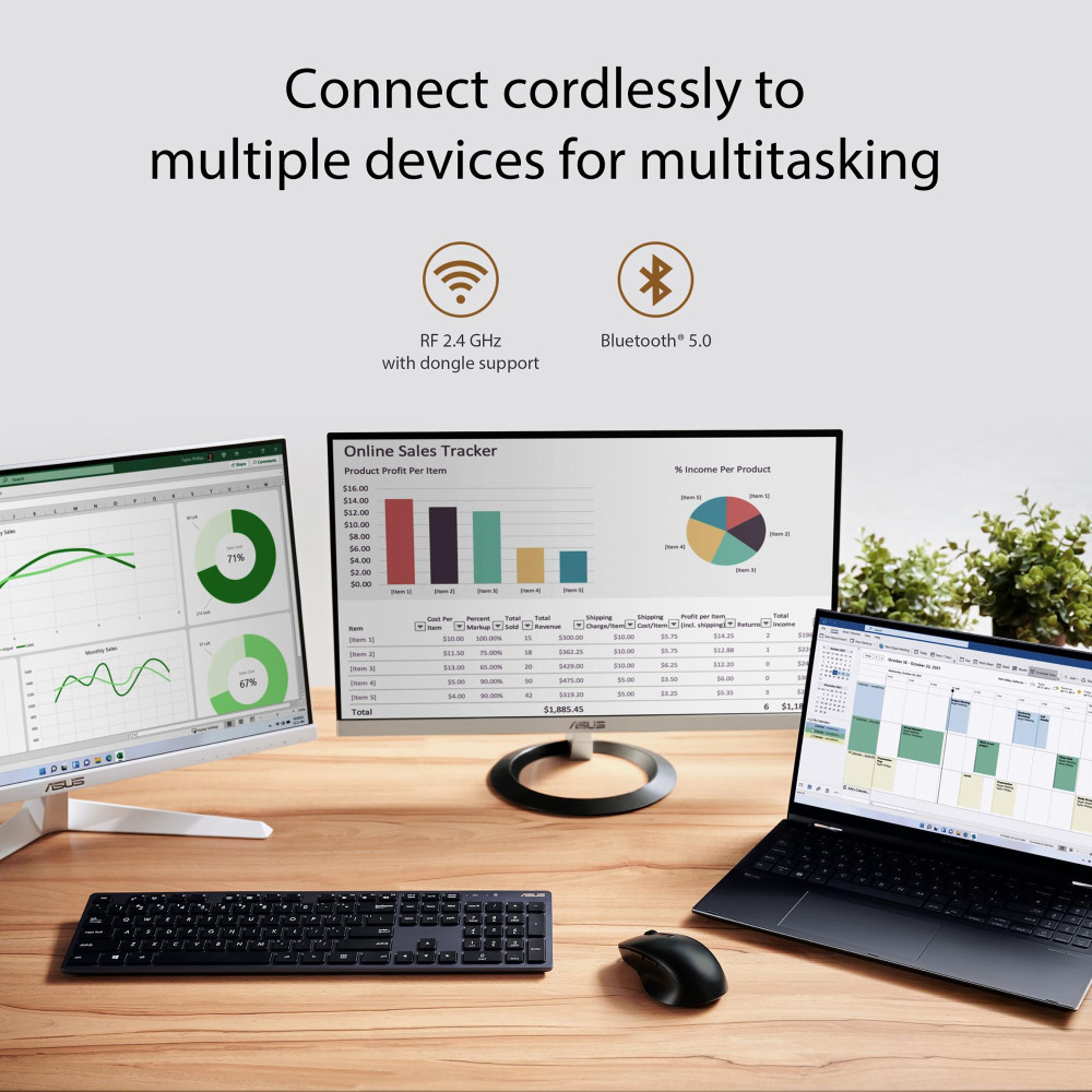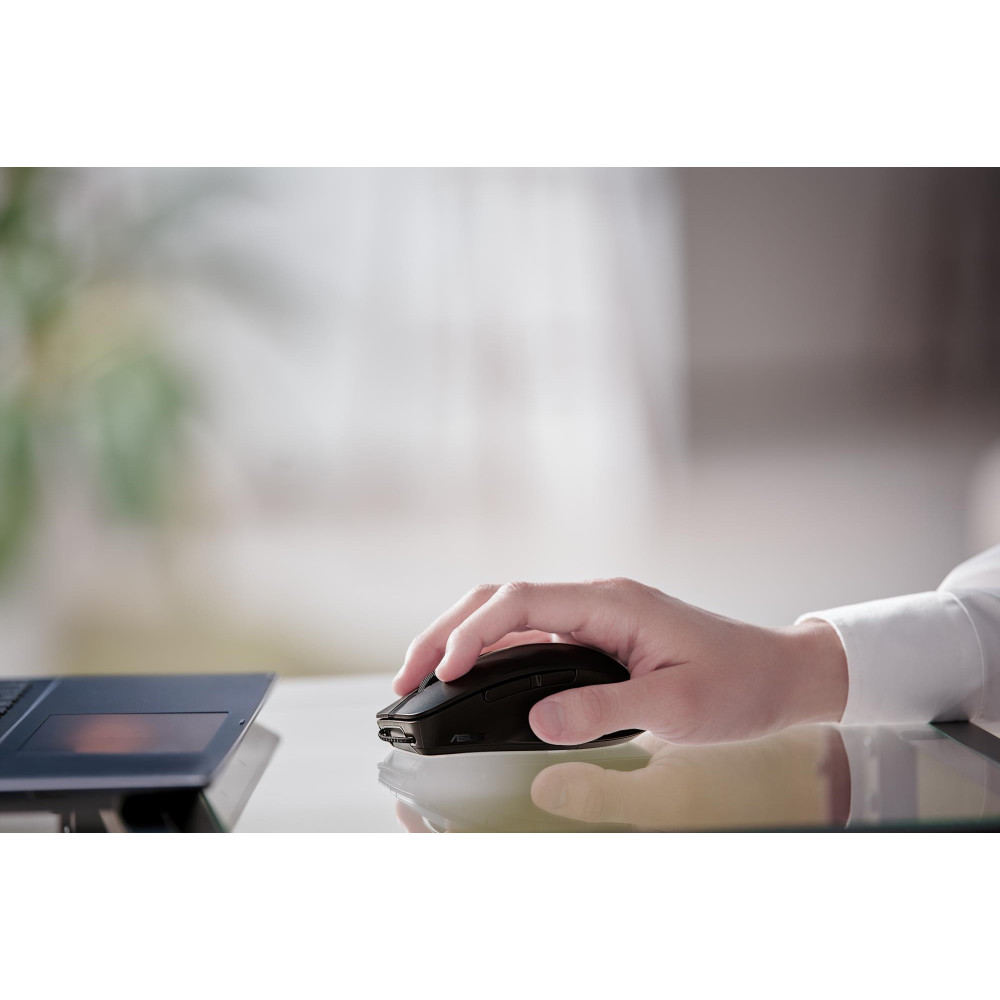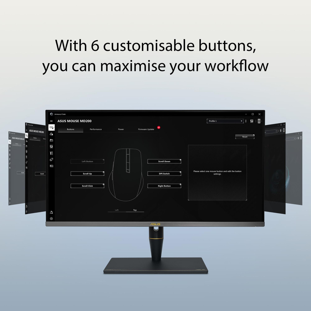 ASUS MD200 MOUSE/BK. Form factor: Ambidextrous. Movement detection technology: Optical, Device interface: RF Wireless + Bluetooth, Movement resolution: 4200 DPI, Buttons quantity: 6, Scroll type: Wheel. Power source: Batteries. Product colour: Black