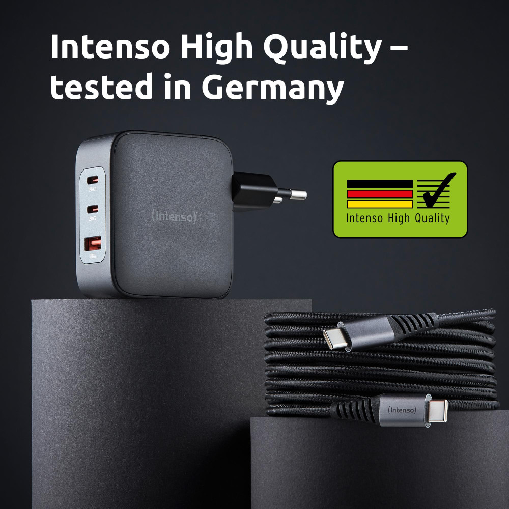 Intenso W100ACC+C520C, Power Adapter + Charging Cable Set, 100W, Fast Charging, GaN, Charge 3 Devices Simultaneously, Black. Power supply type: Indoor, Input voltage: 120 - 140 V, Input frequency: 50/60 Hz. Product colour: Black
