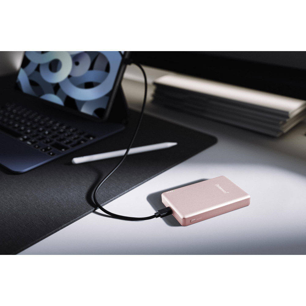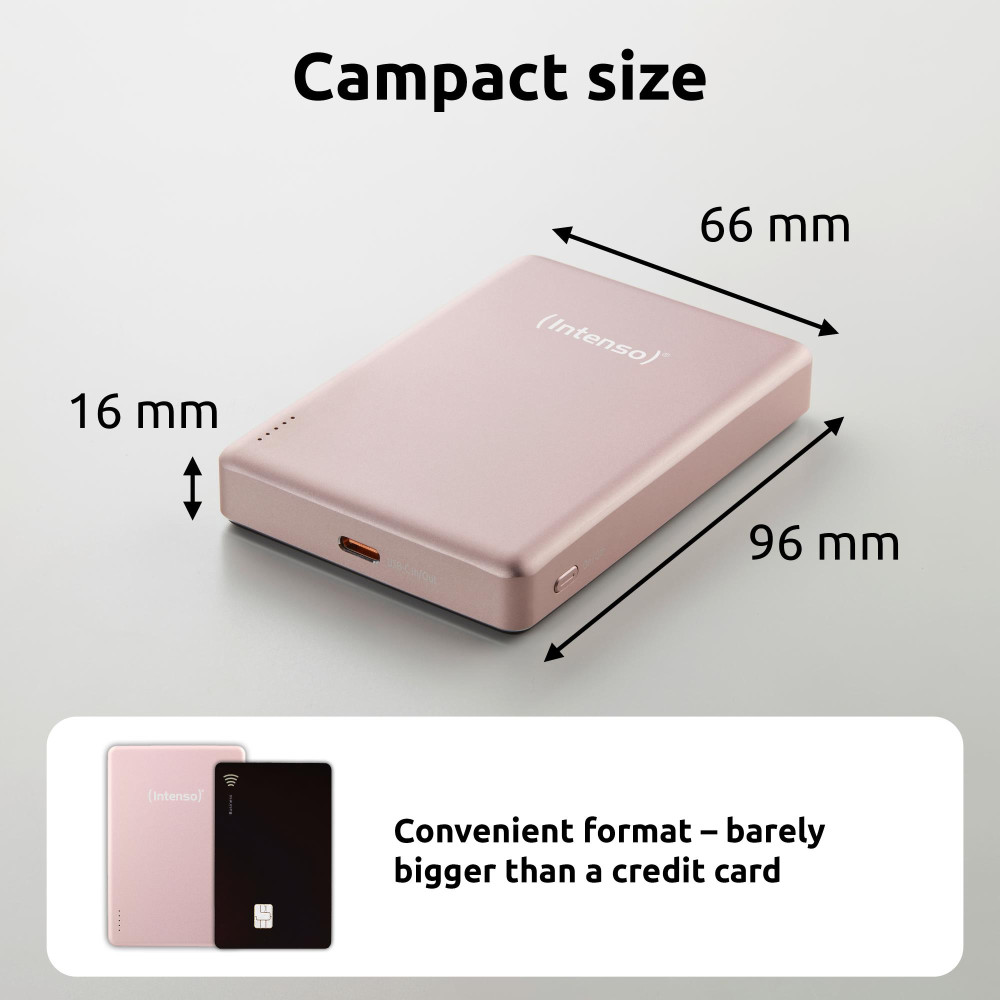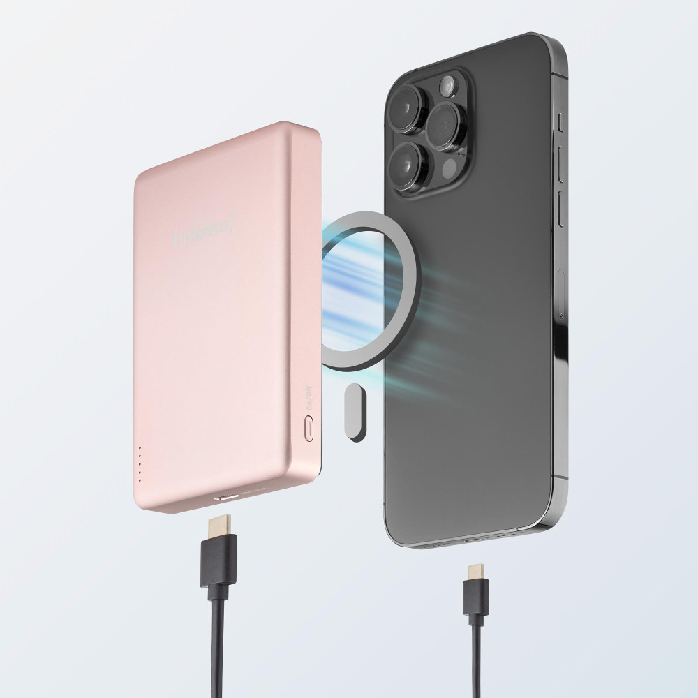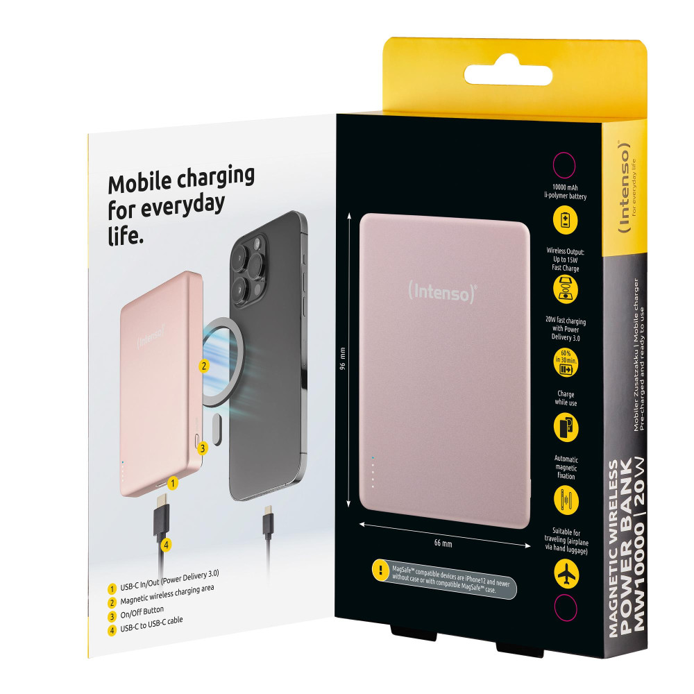 Intenso MW10000 Magnetic Power Bank 10000 mAh – MagSafe Compatible, 15W Wireless Charging, 20W USB-C PD, For iPhone & Android – Tested in Germany – Rosé. Battery capacity: 10000 mAh, Battery technology: Lithium Polymer (LiPo), Fast charging technology: Power Delivery, Programmable Power Supply (PPS), Battery voltage: 3.85 V. USB Type-C ports quantity: 1. Wireless charging. Product colour: Rose