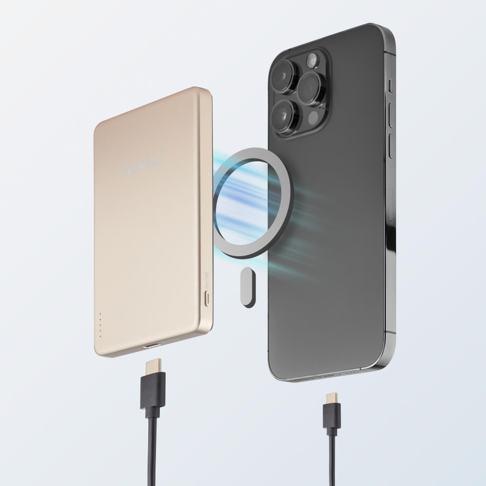Intenso MW5000 Magnetic Power Bank 5000 mAh – MagSafe Compatible, 15W Wireless Charging, 20W USB-C PD, Slim & Compact – Tested in Germany – Champagne. Battery capacity: 5000 mAh, Battery technology: Lithium Polymer (LiPo), Fast charging technology: Power Delivery, Programmable Power Supply (PPS), Battery voltage: 3.85 V. USB Type-C ports quantity: 1. Wireless charging. Product colour: Champagne